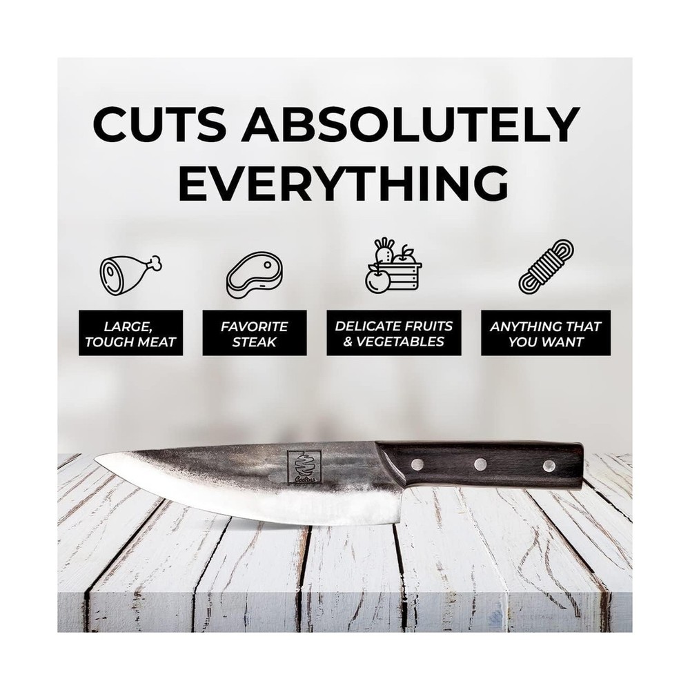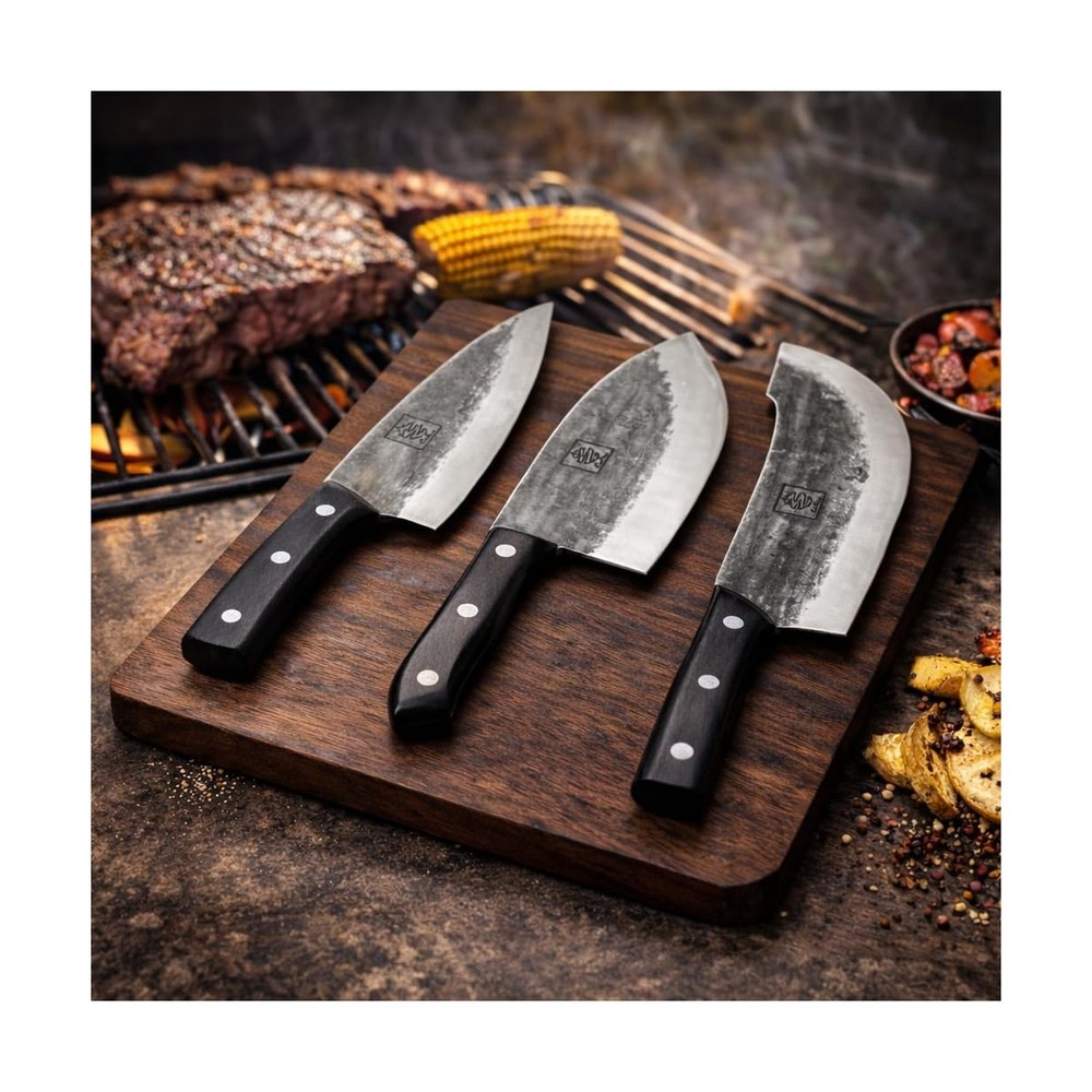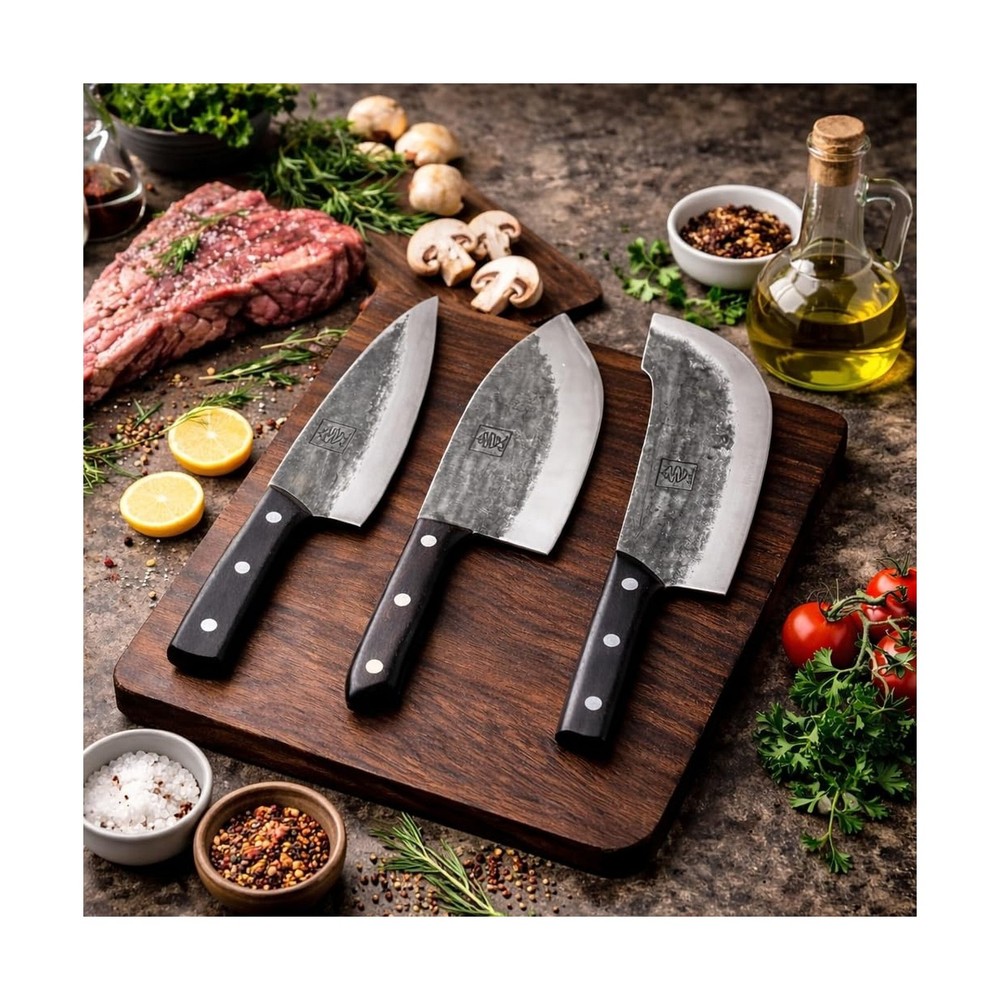 COOLINA The Ultimate Trio Professional Kitchen High-Carbon Steel Knife Set | Handmade Knives for Daily Kitchen Tasks | Full Tang, Ergonomic, Razor Sharp (Tungsten, Galba, Daozi) Description Features: THE ULTIMATE TRIO. The Ultimate Trio doesnt belong in your kitchen, it owns your kitchen. Tungsten, Galba, and Daozi are here to put every other knife set to shame. Precision, power, and performance wrapped in three blades that do it all. PERFECT FOR. This set is perfect for passionate home chefs and backyard barbecue kings who refuse to settle for anything less. Tungsten is your go-to for precision, effortlessly carving roasts and slicing fish. Galba is the heavy hitter, making clean cuts through meat and veggies like theyre nothing. And then theres Daozi that tackles the big jobs, breaking down large cuts of meat and portioning ribs with ease. BEAUTIFUL CRAFTSMANSHIP. These knives perform like power tools and look the part. Forged from high-carbon steel, The Ultimate Trio is built to last. With full-tang construction for balance and ergonomic handles for control, youll slice through anything with ease. Sharp, durable, and downright sexy, these knives are made for those who wont settle for average. BADASS GIFT CHOICE. The Ultimate Trio makes a perfect gift for the culinary enthusiast who values power and precision. Sleek, durable, and built to perform, these knives will steal the spotlight in any kitchen. Perfect for anyone whos ready to level up their cooking and look damn good doing it. Product Details: Blade Material: High Carbon Steel Brand: COOLINA Color: Black Blade Edge: Plain Construction Type: Forged, Full-Tang Blade Material: High Carbon Steel Brand: COOLINA Color: Black Blade Edge: Plain Construction Type: Forged, Full-Tang Blade Color: silver Is Dishwasher Safe: No Item Length: 7 Inches Set Name: The Ultimate Trio Size: 7 inches Material: High Carbon Steel Date First Available: September 17, 2024 Delivery We Do Not Ship Outside of the Continental US. Return Policy All items qualify for returns within 30 days of receipt. Feedback We take our reputation seriously, we buy and sell online, so we understand the value of trust. If you are unsatisfied with your order, please contact us and we will work with you to resolve it to your satisfaction.