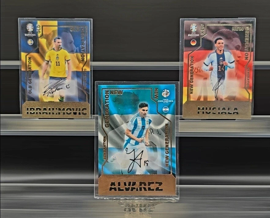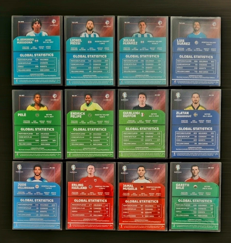 - 12 Trading Card Flash Edition ( Auto Printed Card Limited Edition FoiL ). * THE LAST DANCE. Lionel Messi. Luis Suarez * OLD GENERATION. Maradona Pele Gianluigi Buffon Zlatan Ibrahimovic Gareth Bale * NEW GENERATION. Endrick Felipe Julian Alvarez Jude Bellingham Jamal Musiala Erling Haaland