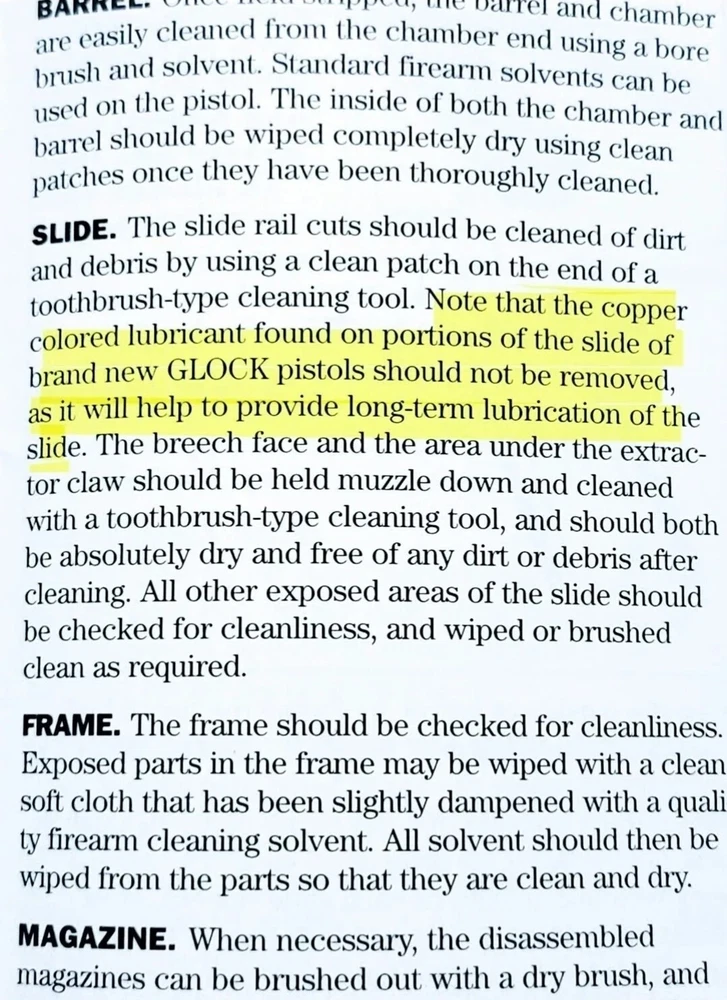 5cc 5ML SIZE The perfect gift for the one who has everything GLOCK. Sure will be a surprise! "The copper colored lubricant found on portions of the slide and trigger connector should not be removed...After cleaning...Apply the copper colored lubricant to portions of the frame, slide and trigger connector..."-Glock Inc 2003 Enhance the performance of your GLOCK pistol with this high-performance lubricant. The Bronze Oilite brand offers a saltwaterproof and heavy-duty lubricant that is perfect for all caliber GLOCK pistols. The 5.0ml unit comes with a syringe for easy application. This lubricant is designed to ensure smooth operation and prevent wear and tear on your GLOCK pistol. It is made of high-quality bronze copper material and contains a copper-colored lubricant that is perfect for enhancing the aesthetic appeal of your pistol. The item weighs only 5.0ml and is manufactured in the United States. Get your hands on this premium quality lubricant and take the first step towards maintaining the optimal performance of your GLOCK pistol. GLOCK The spirit of the age is to make you forget. To forget the genius of Gaston Glock. To not remember the copper colored lubricant found on portions on the inside of new glock pistols. To not remember the instructions of "Should Not Be Removed " To not remember the Glock endurance test of one million rounds fired from a single pistol. COPPER COLORED LUBRICANT The same anti-friction, anti-seize, high temperature, water resistant, no run, copper grease found in a brand new Glock off the assembly line. When you buy a new Glock, you are NOT supposed to clean off the Bronze Oilite copper grease. You are supposed to let it protect against wear and friction over time by itself. This special Bronze Oilite grease serves two important purposes. First, it works as an anti-friction agent as you break in your gun. Bronze Copper is a much softer metal than steel and the polarized petroleum distillate grease is a lot thicker than basic gun grease, these two factors give more protection than standard gun grease for parts with steel on steel contact that take lots of abuse. The second reason Glock applies this is because when they make a new gun, there is no way to know how long it may sit on the shelf before it is sold. This Bronze Oilite anti-seize is ideal for long-term storage. Will not run like typical gun grease or gun oil. This anti-corrosion grease can also be used in place of regular gun grease to protect your springs and magazine spring to keep moisture from rusting them up. Bronze Oilite lubrication can also be used in other firearms as well. Just a dab of this at a time because a little of this copper colored lubricant goes a long way. Place a small drop on the rails and some other metal on metal contact areas or anywhere else you would use traditional gun grease. The spirit of the age is to forget the Glock endurance test of 1 million rounds fired from a single Glock 17 with only this proven superior copper colored lubricant inside. Without breaking a single part and only replacing worn magazines. Unmatched performance from a single pistol, with credit going to the copper colored lubrication that no other wet oil or gun grease can provide. ◇ Glock endurance tested 1 million rounds fired from a single pistol* Anti-friction...IMPORTANT INSTRUCTIONS: DO NOT DILUTE. The Bronze Oilite ball bearings are designed to attach to the pores of the steel and rotate freely in the Polarized petroleum distillates. ◇*08-02-2010 | 12:44 PM SJgunguy24 *The old National Shooting Club in Santa Clara had a G 17 that had 1,000,000 rounds. The Glock factory purchased back that pistol for testing. My 17 is close to 50K
