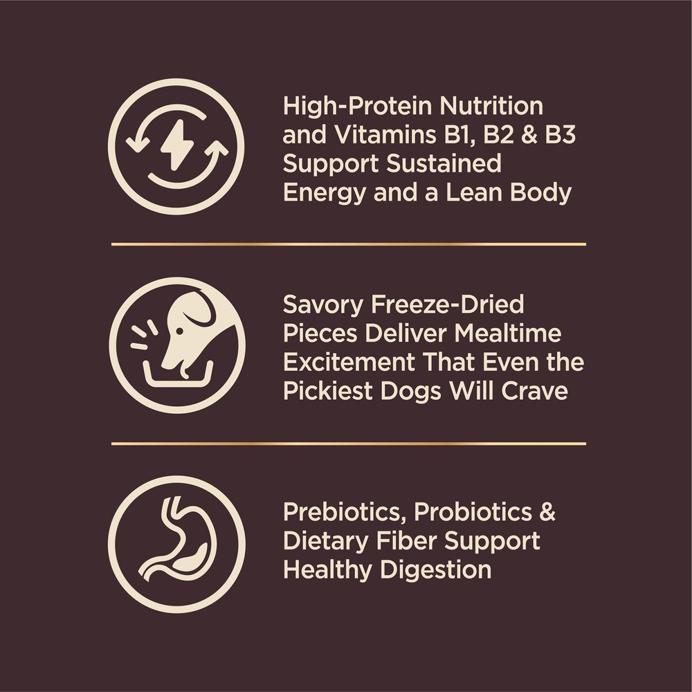 ALL NATURAL SMALL BREED ADULT DRY DOG FOOD: Protein packed, nutrient dense kibble combined with 100% raw freeze-dried turkey pieces for a crave worthy savory dog food; with optimal protein levels and high fiber content your dog needs to thrive. LEANER BODY MASS AND MUSCLE TONE: Based on the nutritional philosophy that dogs thrive on a natural diet mainly comprised of meat, this dog food is made with high quality protein ingredients. SUPPORTS DIGESTIVE HEALTH AND HEALTHY COAT: Contains guaranteed levels of glucosamine for strong joints, probiotics for digestive health, omega fatty acids for healthy skin and coat, and taurine for a healthy heart. NO CORN, WHEAT, OR SOY: Contains only premium, all natural ingredients with no poultry by-products, wheat, wheat gluten, corn, soy, artificial colors, or preservatives. Manufactured in a facility that also processes grains. MADE IN USA: Using only the finest globally sourced ingredients, we prepare each of our diets in our own state of the art facility; we craft delicious natural recipes with wholesome ingredients chosen for their nutritional benefits