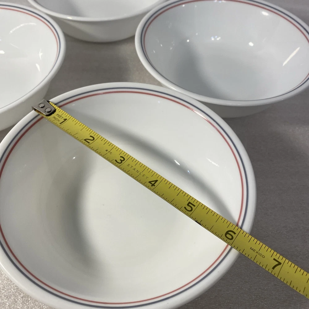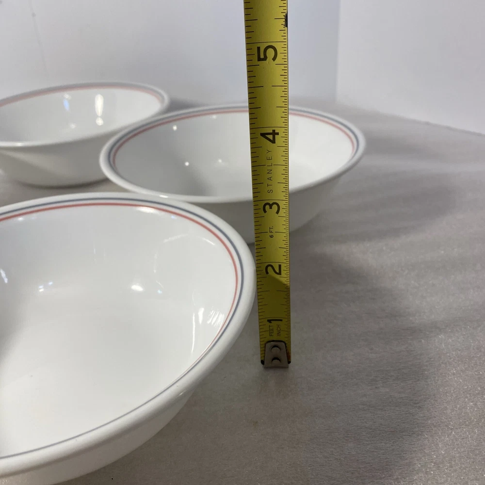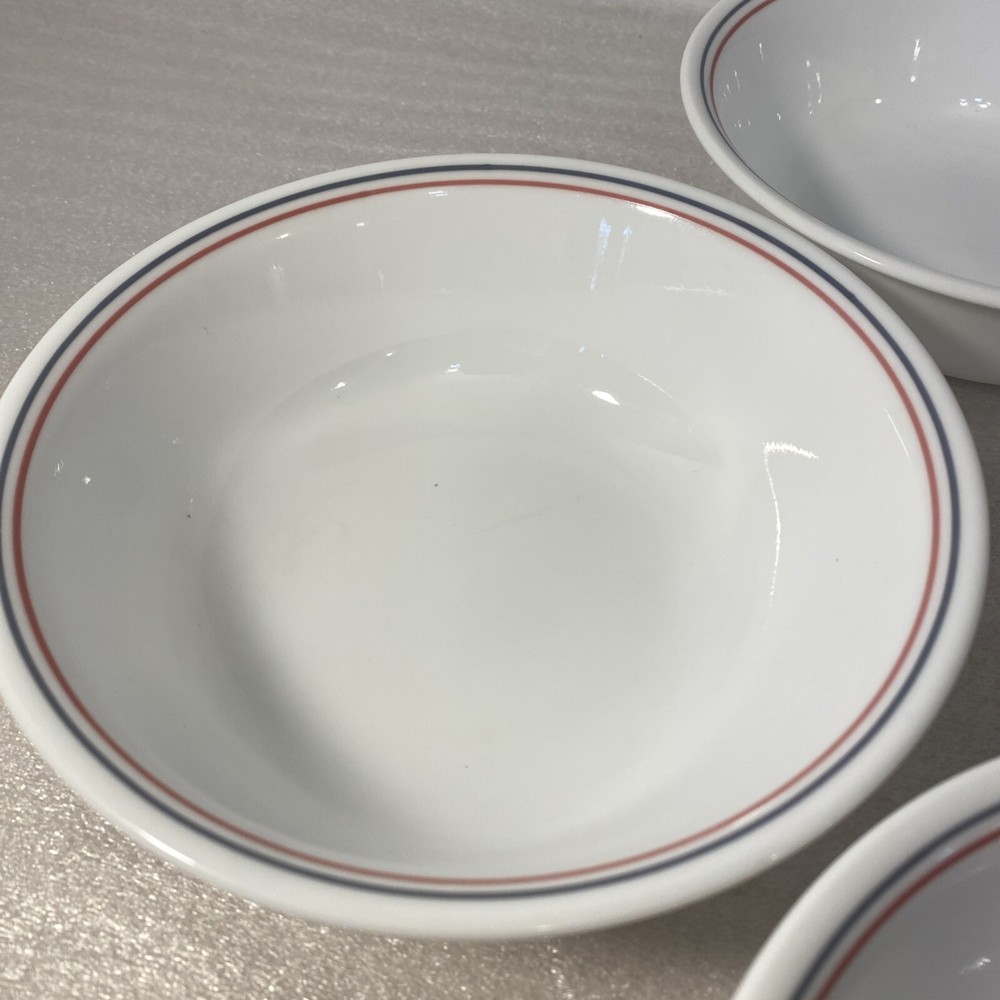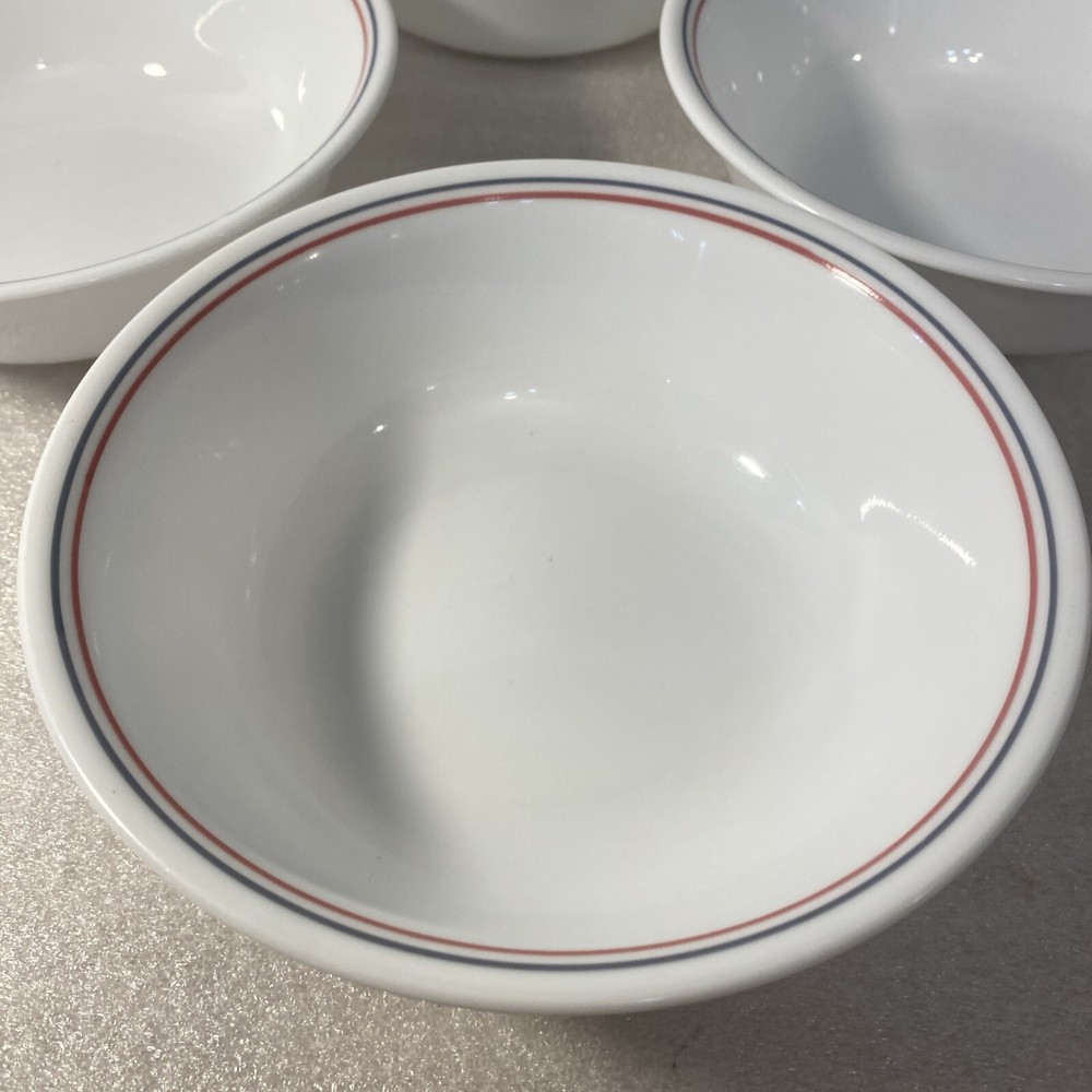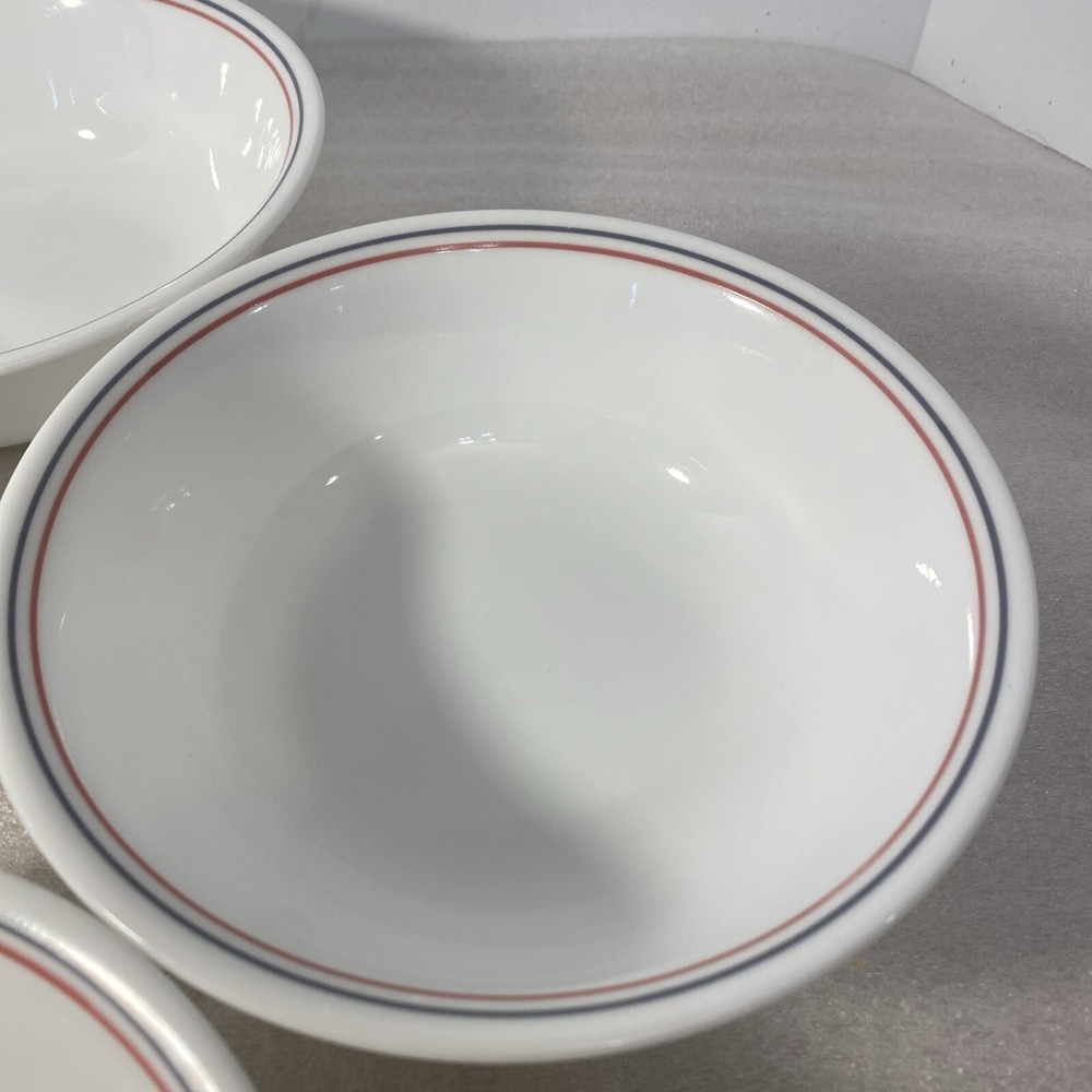CORELLE - PRINSTON - 4 Soup Cereal Bowls - Red Blue Stripes Band. Condition is Used. Shipped with USPS Ground Advantage.