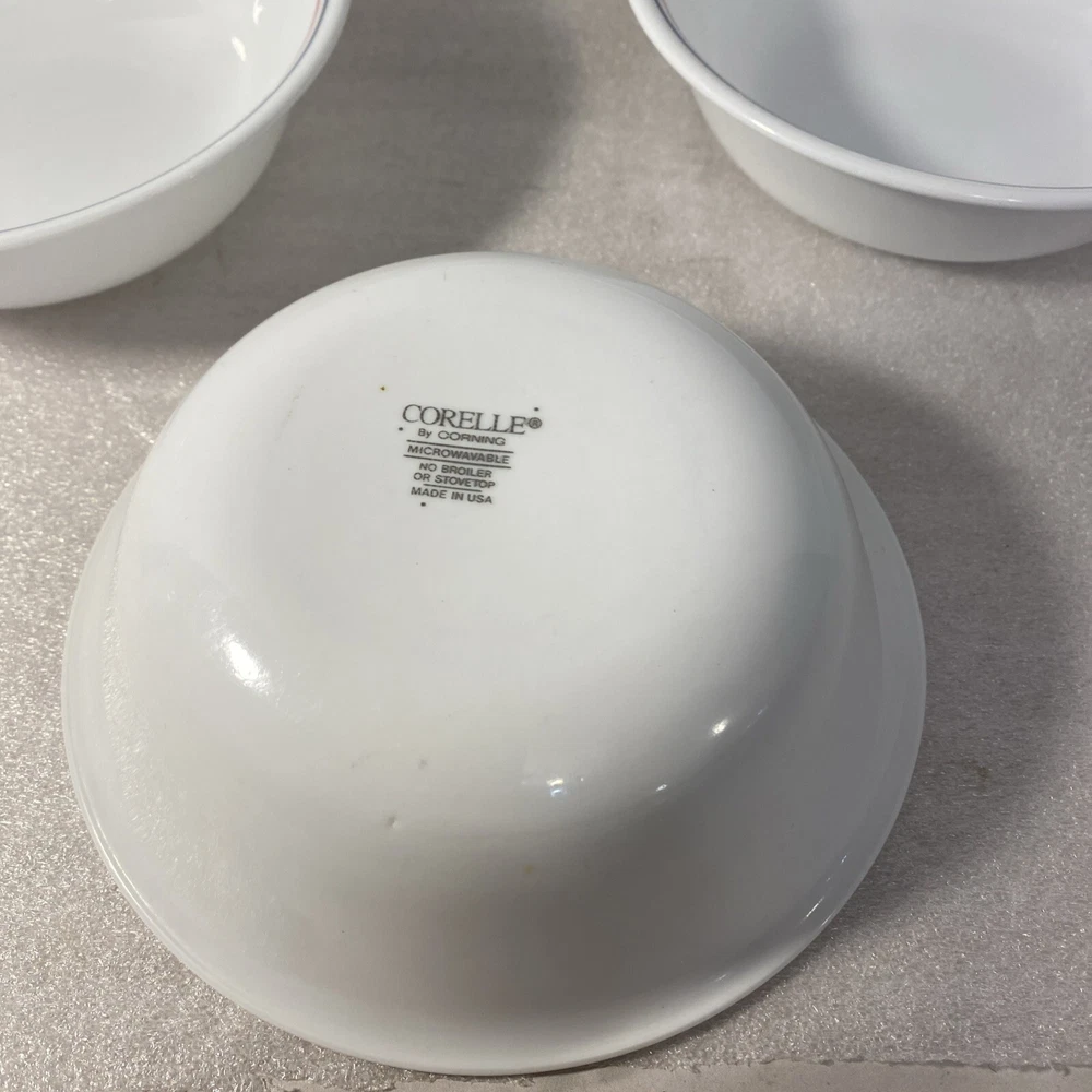 Brand: Corelle Type: Cereal Bowl Vintage: Yes Shape: Round Handmade: No Item Diameter: 6 1/4” Set Includes: Soup Bowl Material: Glass Item Height: 1 7/8” Number of Items in Set: Four-Piece Color: Multicolor Antique: No