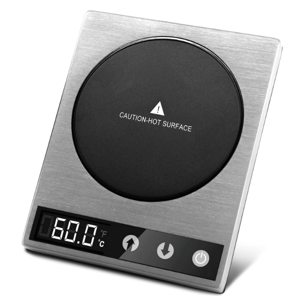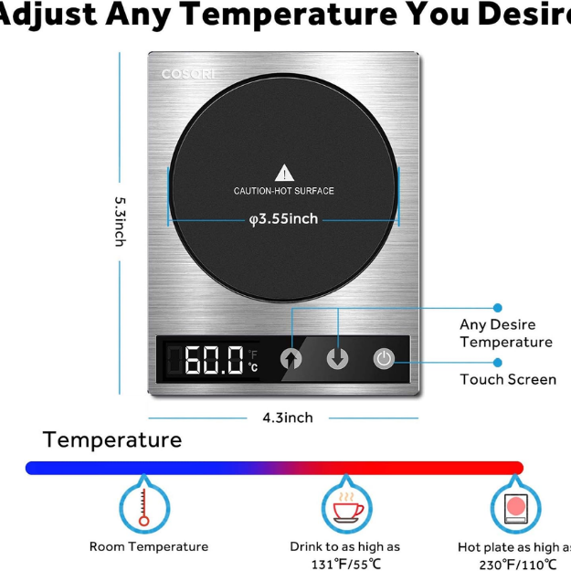 Brand: Cosori Power: 24 W Capacity: 17 oz Type: Coffee Mug Warmer Model: CO162-CWM Color: Black Power Source: Wall Plug-In Compatible Model: Universal Compatible Brand: Universal Material: Stainless Steel, Plastic Finish: Metallic Suitable For: Coffee, Tea, Milk, Hot Beverages Features: Adjustable Temperature, Fahrenheit & Celsius Switch, Spill Resistant, One-Touch Controls