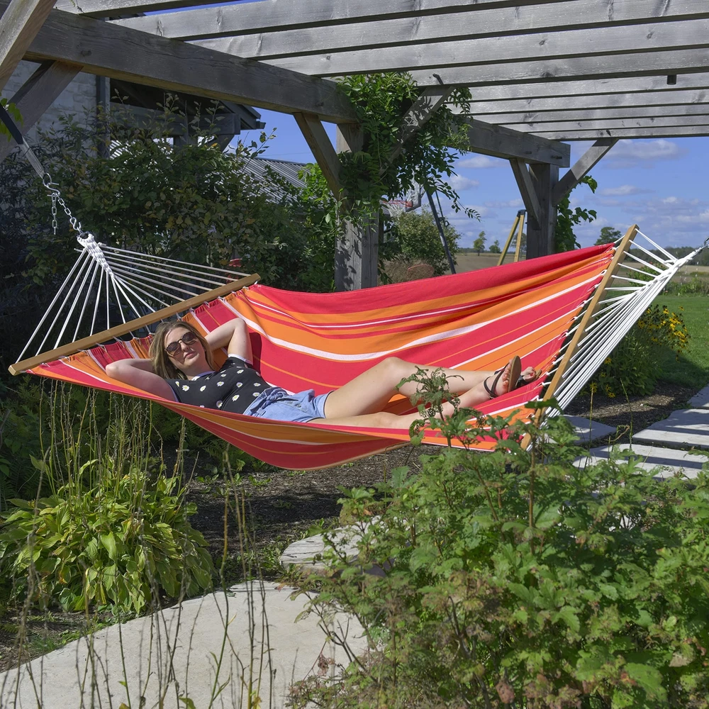 This single-layer cotton spreader bar hammock combines the comfort and breathability of a ’s cotton hammocks with the beauty and functionality of a spreader bar hammock. Choose from ’s top-selling hammock colours and patterns now available in a spreader bar hammock with a wood bar sealed and coated with stain. This hammock is easy to set up between posts, trees or pair with of ’s large hammock stands. Easily roll and the hammock during unpleasant weather. The double wide hammock is made of soft, breathable cotton – the perfect summer relaxation spot. Created with a sealed wood bar and strong, durable polyester ropes. Hammock rolls into compact bundle for easy storage with Ultra-Lite Tree Straps, or Eco-Friendly Hammock Tree Straps. Accommodates adults, for a total capacity of 450lb.