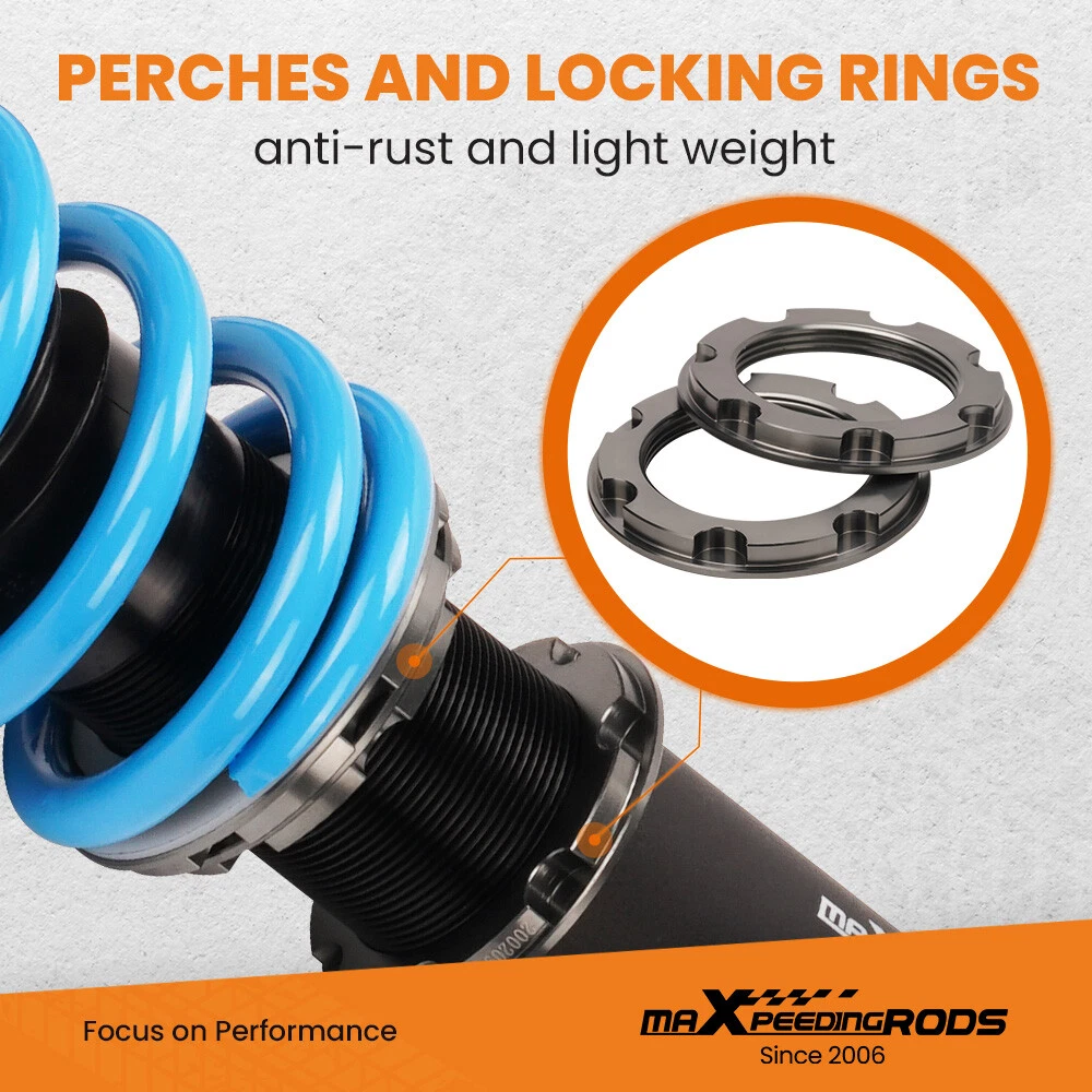 maXpeedingrods Canada Store Home About maXpeedingrods View Feedback Contact Us WHY CHOOSE US COT6 series 24 Damping Levels Coilover For Honda Accord VI 2-door coupe CG2 CG3 Description Application For Acura TL II UA5 1999-2003 USA including type s For Acura CL II YA4 2001-2003 USA For Honda Accord VI 4-door sedan CG1 CG5 CG6 1998-2002 USA For Honda Accord VI 2-door coupe CG2 CG3 1998-2002 USA For Honda Accord 1998-2002, Not for UK manufactured vehicle Specification Front and Rear top mount: Rubber Damper: 24 levels rebound damping adjustable Front spring rate: 10kg/mm(560 lbs/in) Rear spring rate: 6 kg/mm (336 lbs/in) Adjustable height: Yes lowering 1" to 3" Shock type: Twin tube Spring Preload: 7-10 mm Color: Black body with blue spring Package included Complete coilovers assembly 2 front and 2 rear A pair wrench for height adjustment Dimension Package: 71*51*21cm Weight: 25340g Feature 1. Lowered height adjustment from 1" - 3" which allow lower center of gravity and also add a more aggressive stance. 2. A 24 rebound damping adjustment level allows you the ability to perfectly dial in your coilover setup. You will experience better ride quality in all road conditions. 3. Pillow ball top mounts improve the steering feel and response. 4. Full length dust boot keeps shaft and oil seal from damage. 5. Upgraded damper adjust knob makes damping setting easier. 6. Upgraded valving for more smooth ride. 7. Twin-Tube structure allows sufficient stroke within the shock absorber. 8. High-Performance Damping Oil--maintains a stable viscosity in a broad temperature range, which sustains smooth stroke and reliable damping force in a variety of circumstances. 9. High Tensile performance spring - STRESS TESTED OVER 600,000 times while the spring distortion is less than 0.04%. 10. Decent appearance benefits from CNC machined parts and special surface treatment. 11. Most pieces in our coilover systems, including mounts, collars and spring perches, are made from 6061-T6 Billet Aluminum resulting in light weight, durable and rust resistant components. 12. Complete Suspension Kit of 4 Shock Absorbers & 4 Springs for an easy installation. 13. Separate height adjustment does not affect damper stroke and height can be adjusted with coilovers installed on the vehicle. 14. All coilovers were produced and assembled at dust-free factory which guaranteed the highest quality. Notice * Professional installation & alignment suggested. * Please check our store for other auto parts you may be interested in. Other items you might also like Coilovers Coil Spring Shock Strusts For Mitsubishi Lancer (CX/CY) 2008-2016 24 Ways Adjustable Damper Coilovers For Lexus IS300 IS200 JCE10L GXE10 1999-2005 Street Coilovers Suspension For Nissan S13 Silvia 240SX 200SX 180SX 1989-1998 24 Damping Level Coilover For Honda Civic 4-door Sedan FA1 FA2 FA3 FA4 FA5 06-11 24 Ways Adjustable Damper Coilover For Honda Civic EJ EK EM 96-00 Acura Integra Coilovers Suspension Kit For Ford Ford Mustang S-197 2005-2014 Spring & Shock maXpeedingrods T6 Adjustable Damper Coilover For MINI Clubman R55 Cooper 07–14 Street Coilovers Suspension For Hyundai Genesis Coupe 2010-2016 2-Door ONLY 24 Ways Adjustable Damper Coilover For Toyota Corolla E140 E160 E170 2014-2019 maXpeedingrods T6 Adjustable Damper Coilover For MINI Cooper R50 R53 FWD 01-06 24 Damping Levels Coilovers for Mitsubishi Lancer ES CS6A FWD 2002-2006 Ralliart Coilover Lowering Kit For BMW 3 E90 E91 RWD 330i 318i 320i 323i 325i 328i 04-11 About MaXpeedingrods Shipping Policy Returns Policy
