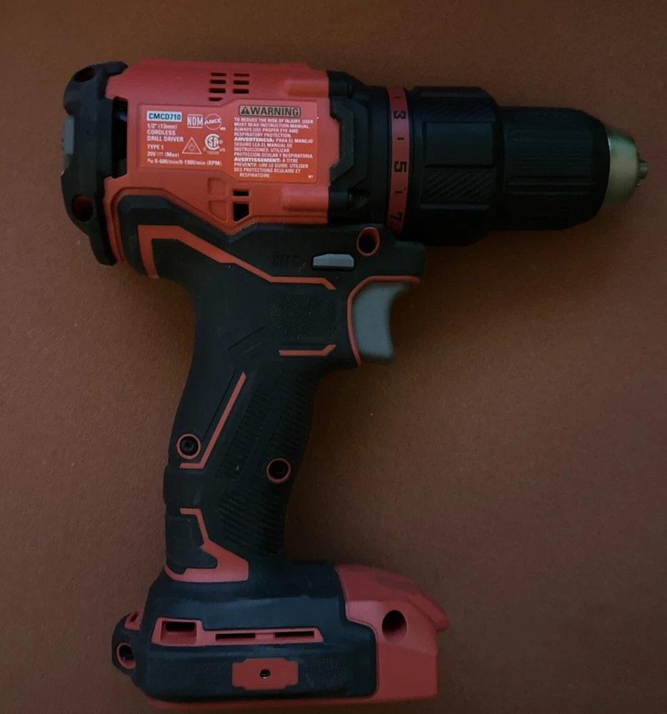 This is a Craftsman 20V CMCD710 Brushless Drill with a 1/2" keyless chuck, operating at 1900 RPM. It is a cordless drill powered by a 20V battery. The model does not come with a battery included. This drill is designed for various drilling tasks in workshops and homes. Very lightly used