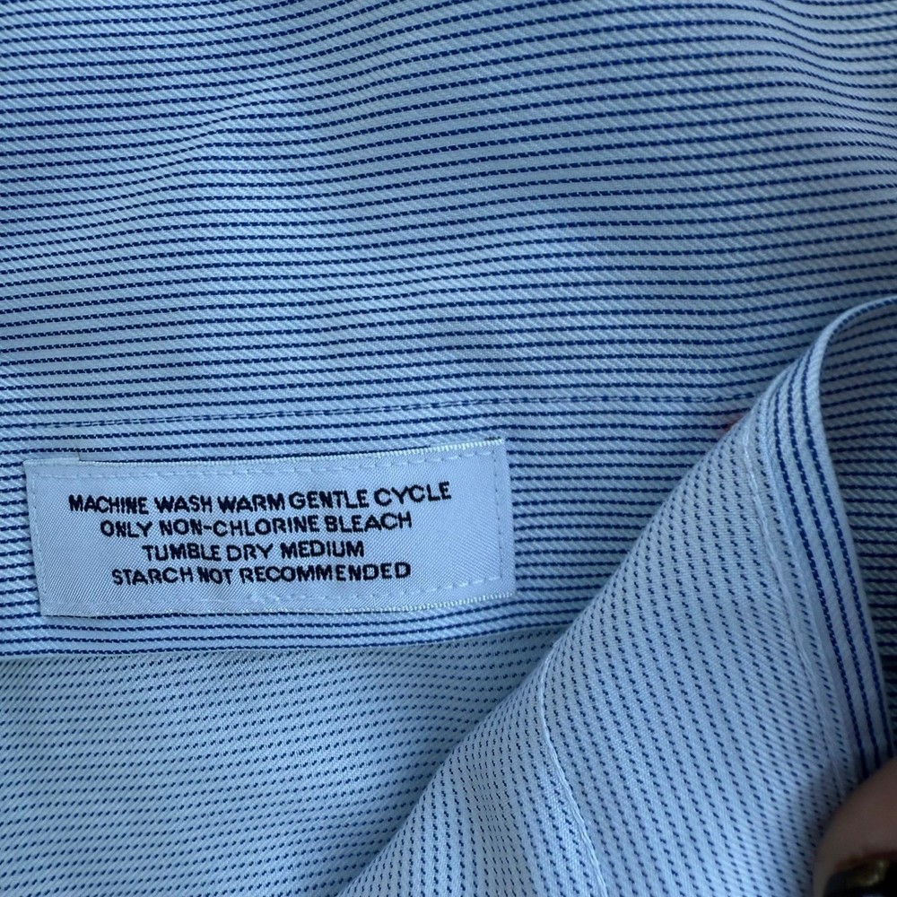 CREMIEUX men's long sleeve button down dress shirt crafted from 100% Pima Cotton. This non-iron shirt features a classic blue stripe pattern, a single chest pocket, and button cuffs. The fabric offers a smooth feel and is designed for easy care, making it a reliable choice for any wardrobe. The button-down collar provides a polished finish. Department: Men Neck Size: 16.5 in Fit: Regular Sleeve Length: Long Sleeve Type: Dress Shirt Pattern: Striped Collar Style: Point Material: 100% Cotton Top Cuff Style: Barrel Cuff Features: Non-Iron, Pockets Neckline: Collared Closure: Button Fabric Type: Woven Accents: Button, Logo Occasion: Business, Workwear, Casual Keywords: mens dress shirt, cremieux shirt, non iron shirt, pima cotton, blue stripe, button down, collared shirt, long sleeve, menswear, business casual, professional attire, classic fit Item is preowned, effort has been made to ensure all flaws are displayed photos serve as additional description Sizing varies by manufacturer and time period, please see measurements.