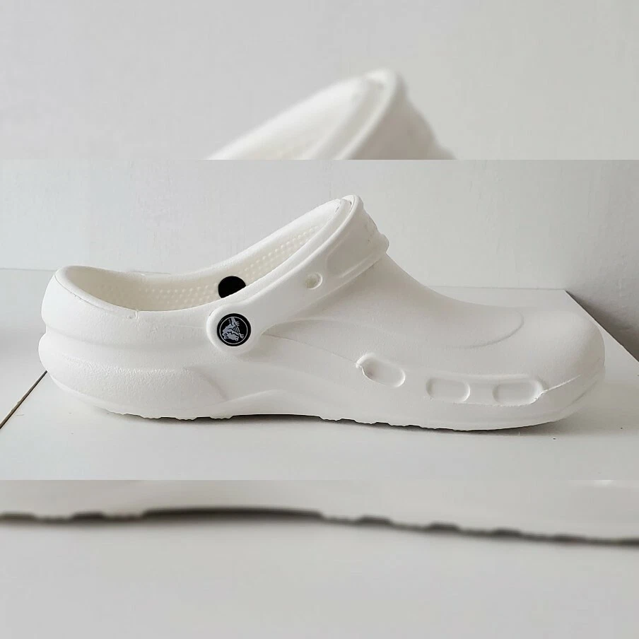 CROCS AUTHENTIC AT WORK ESPECIALIST CLOG SHOES SANDALS MEN'S WOMEN'S CERTIFIABLY COMFORTABLE SIZE M8 W10 WHITE LIGHTWEIGHT NEW WITH TAGS. The Crocs™ Specialist CLOGS, work shoes that let your feet breathe. With an increased metatarsal area, this clog offers additional protection for the top of your foot. A croslite™ footbed, closed heel and raised edging around the portals make this the perfect shoe for work. New professional styling creates the ultimate comfort shoe for the workplace. Designed to meet workplace standards with a closed heel. Exclusive croslite™ material conforms to foot creating a custom fit. Supportive arch and footbed circulation nubs ensure all-day comfort. Side ventilation ports promote airflow and are inset to protect foot from spills. Thicker metatarsal area helps protect the top of the foot. Loose fit allows foot to bend and expand naturally. Odor resistant and bacteriostatic. Simply sterilize and clean in water and bleach.FEATURES EVA upper Slip-on with pivoting strap Round toe Croslite™ foam contoured EVA footbed EVA sole Imported