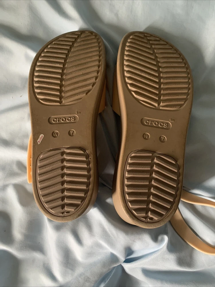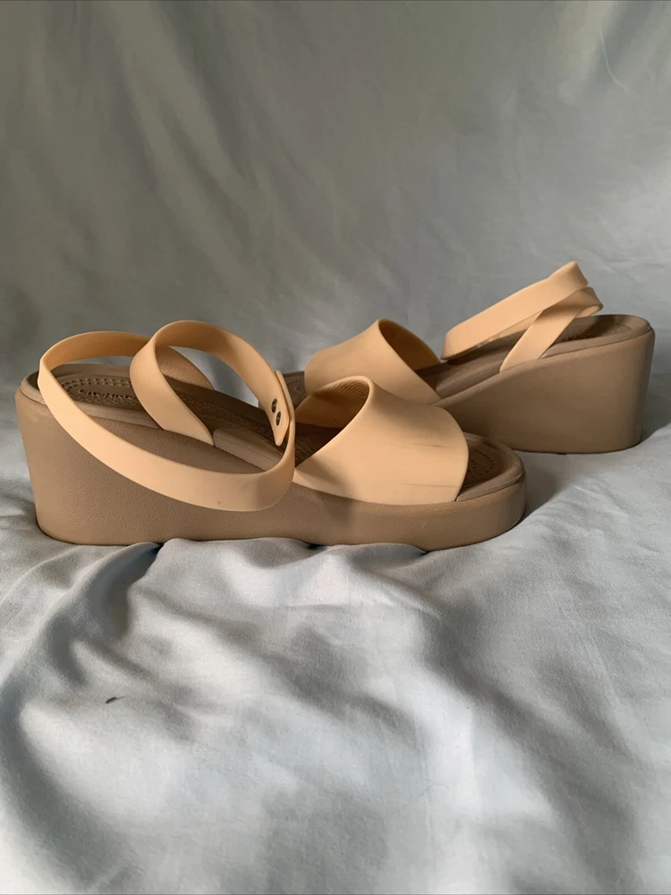 Elevate your casual look with these stylish Crocs Brooklyn ankle strap wedge sandals in nude/shitake. The slip-on design and solid pattern make them perfect for any casual occasion, while the flat heel ensures comfort all day long. The ankle strap adds a touch of sophistication and the synthetic material provides durability for the summer and spring season. These sandals feature a rubber upper material and synthetic lining and insole material. The outsole is also made of synthetic material. The Crocs Brooklyn Wedge model is a perfect addition to any woman's shoe collection. Get your hands on these sandals today and make your casual outings more stylish! Bought brand new and worn 2 times for a wedding rehearsal and the wedding.