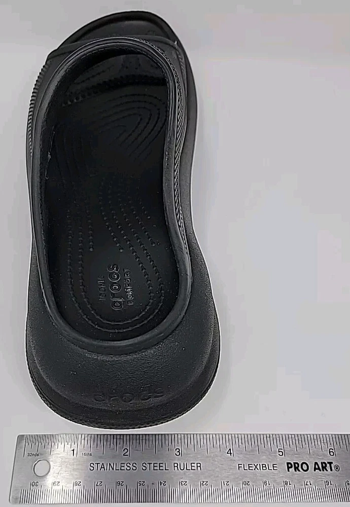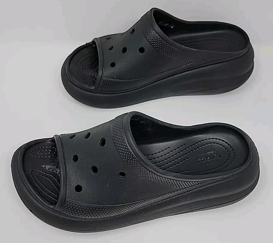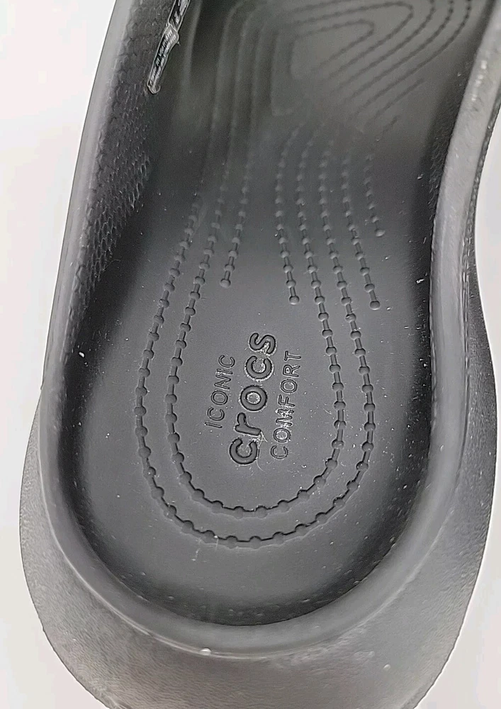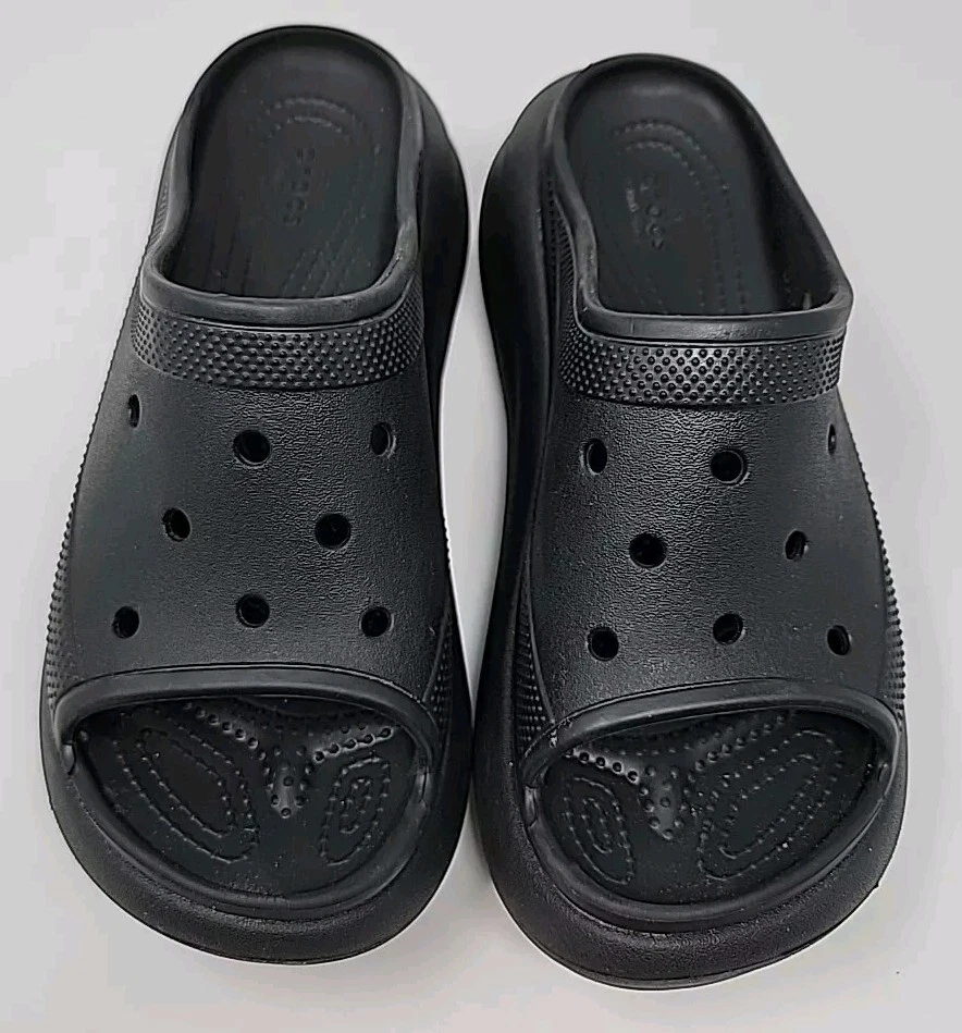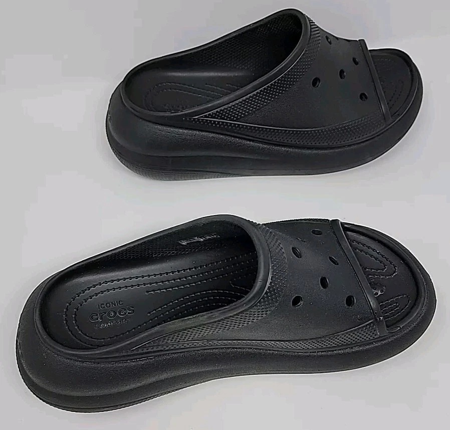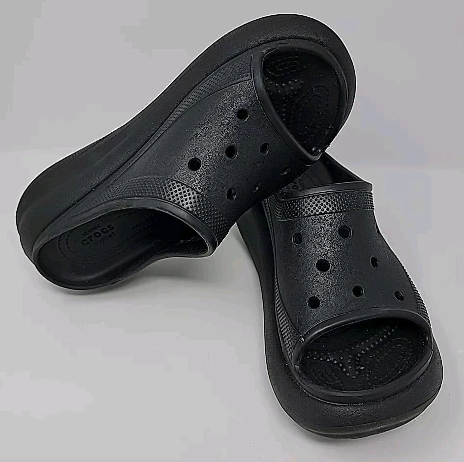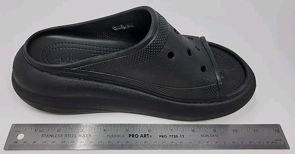 The Crocs Classic Crush Slide sandals in black are designed for both men and women in a unisex size 8. Featuring a slip-on style with a comfortable wedge heel, these platform sandals are perfect for casual wear. Made from rubber, these sandals offer a solid construction with a mid-height heel of 2-2.9 inches for added lift. The Crocs brand is known for its comfort, making these sandals a practical and stylish choice for everyday wear.