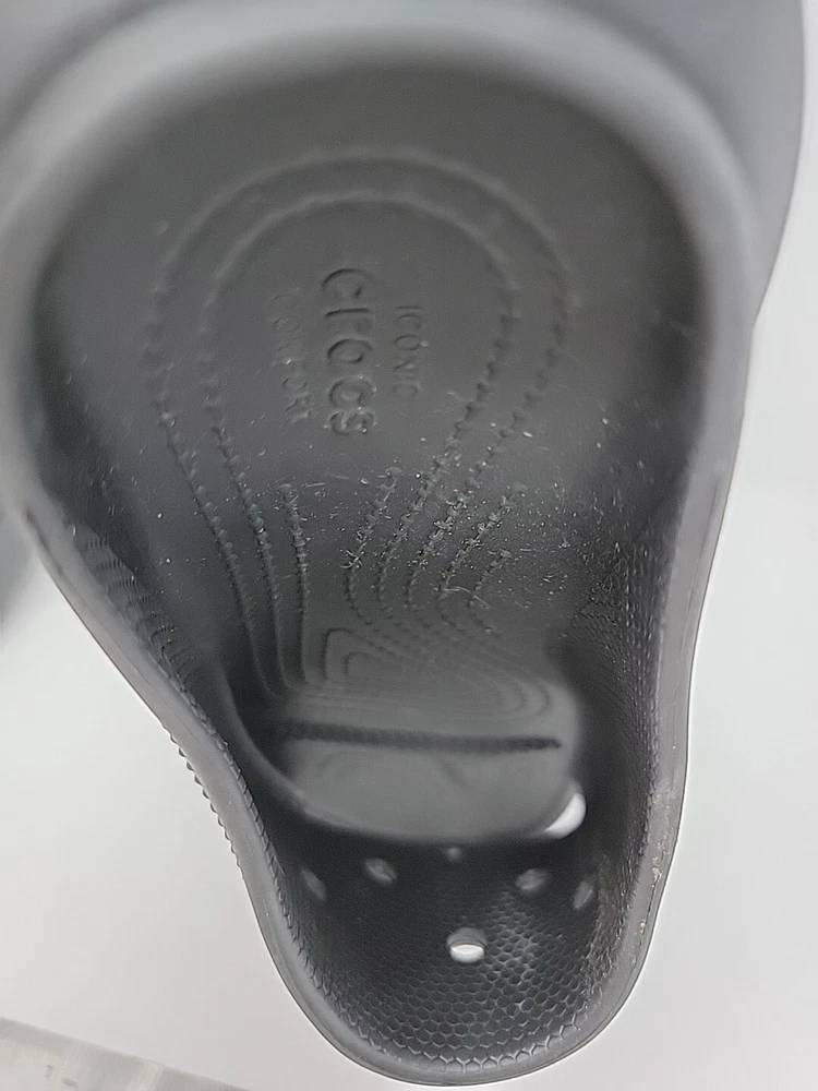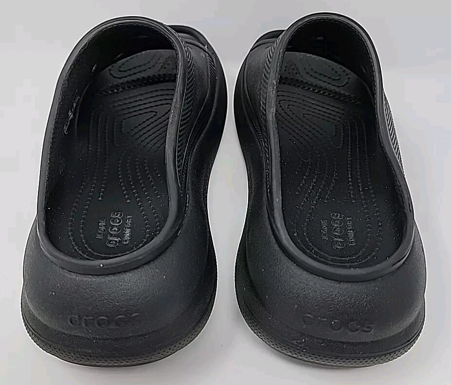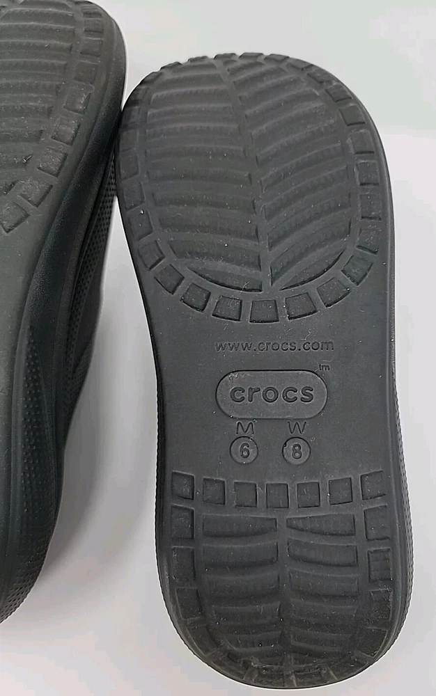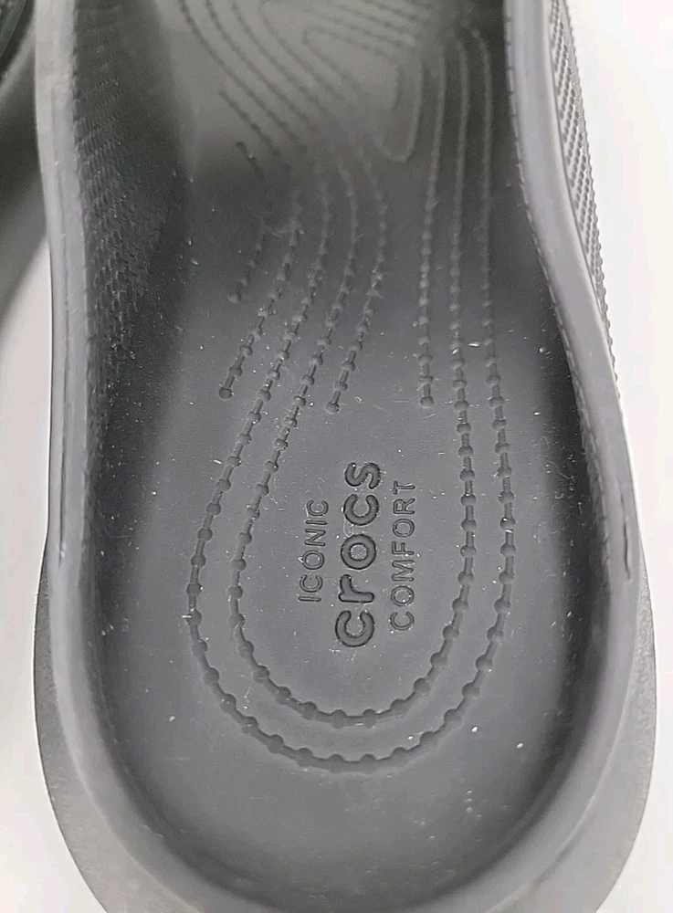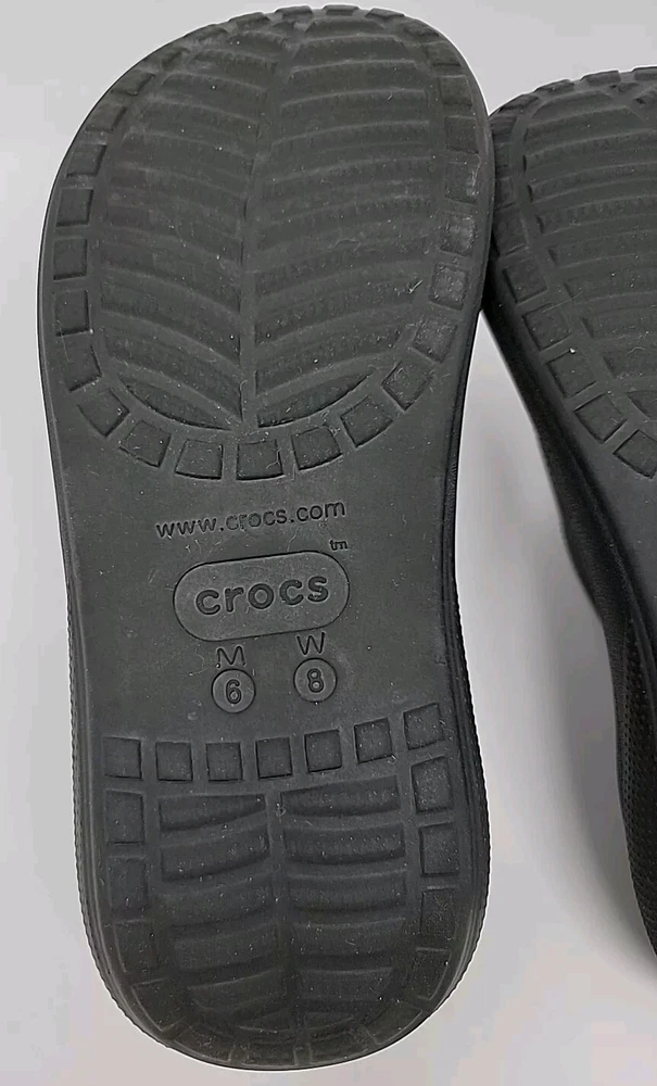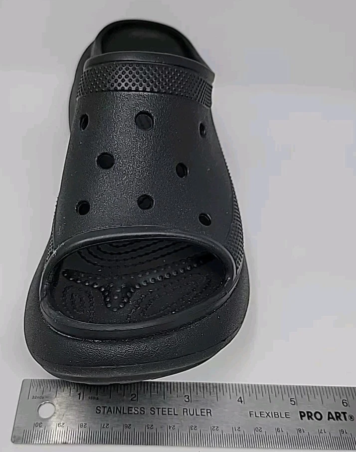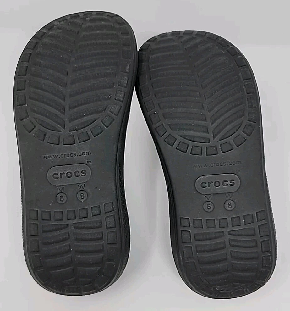 The Crocs Classic Crush Slide sandals in black are designed for both men and women in a unisex size 8. Featuring a slip-on style with a comfortable wedge heel, these platform sandals are perfect for casual wear. Made from rubber, these sandals offer a solid construction with a mid-height heel of 2-2.9 inches for added lift. The Crocs brand is known for its comfort, making these sandals a practical and stylish choice for everyday wear.