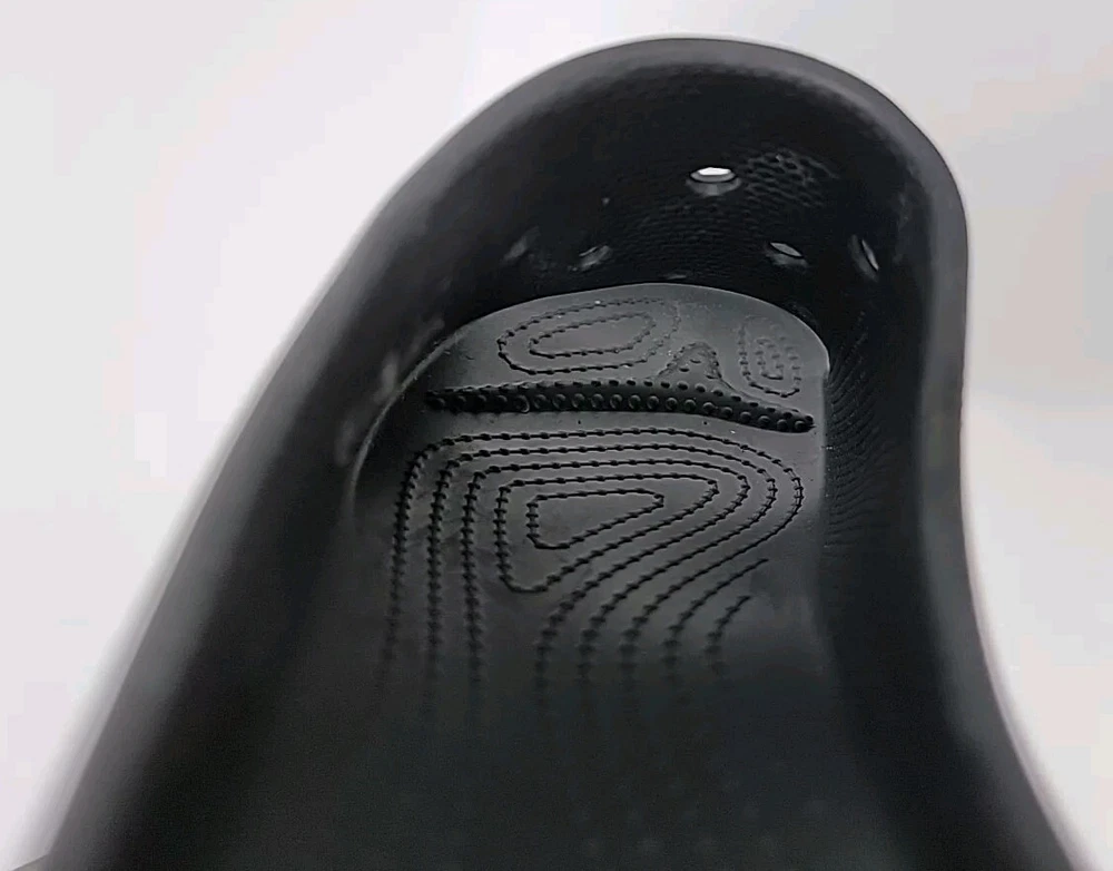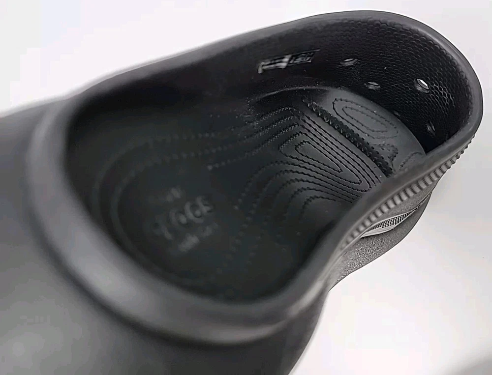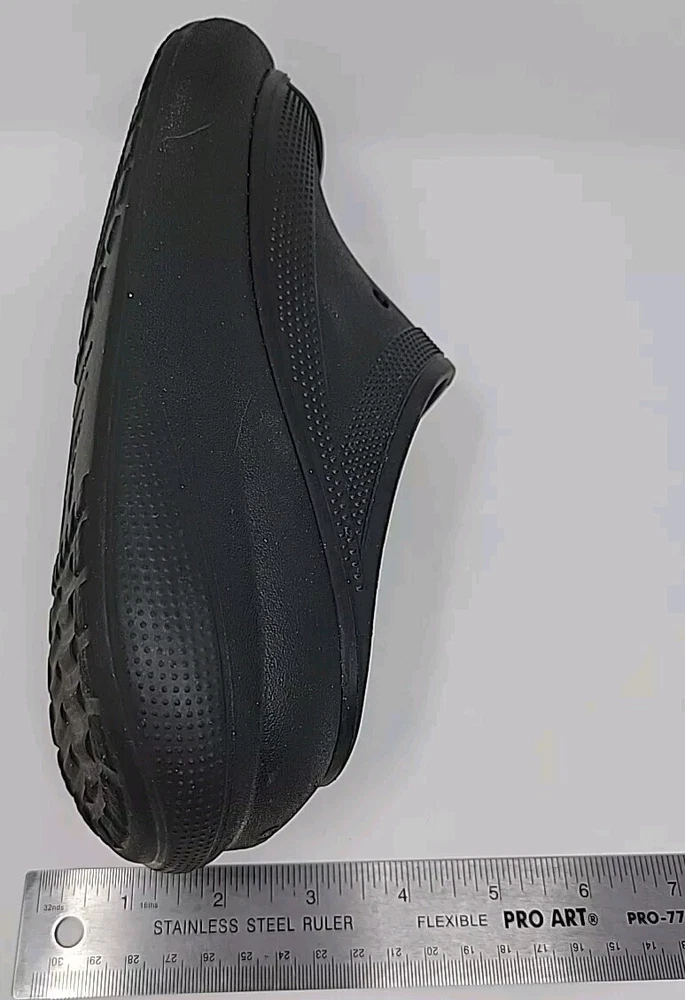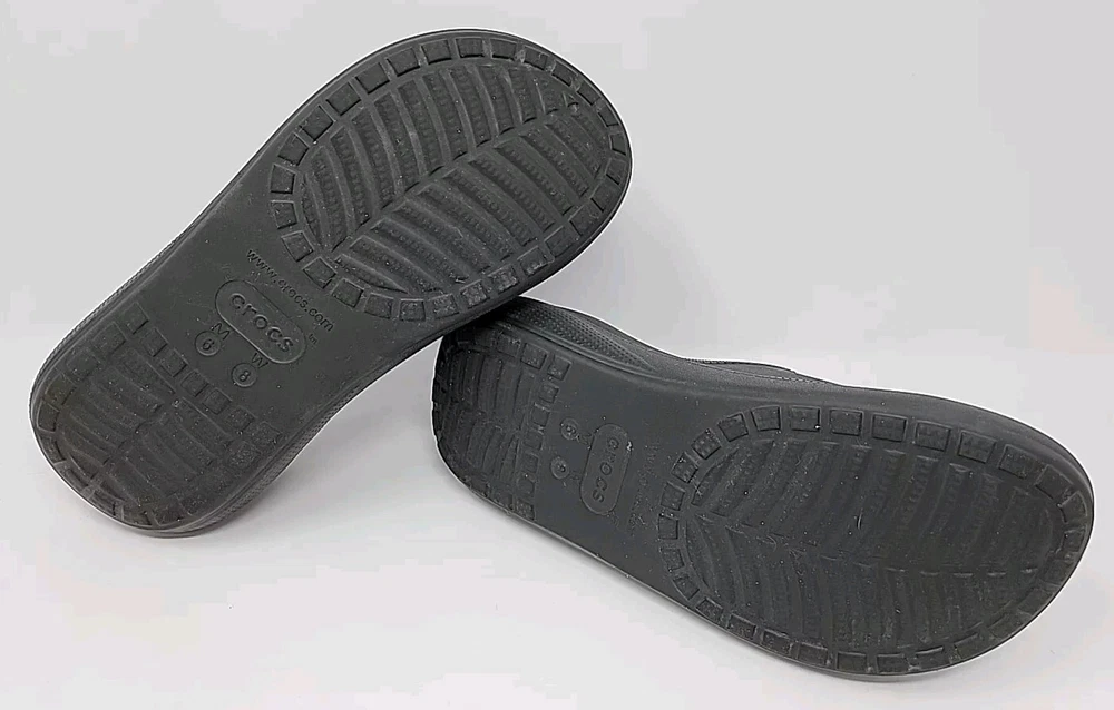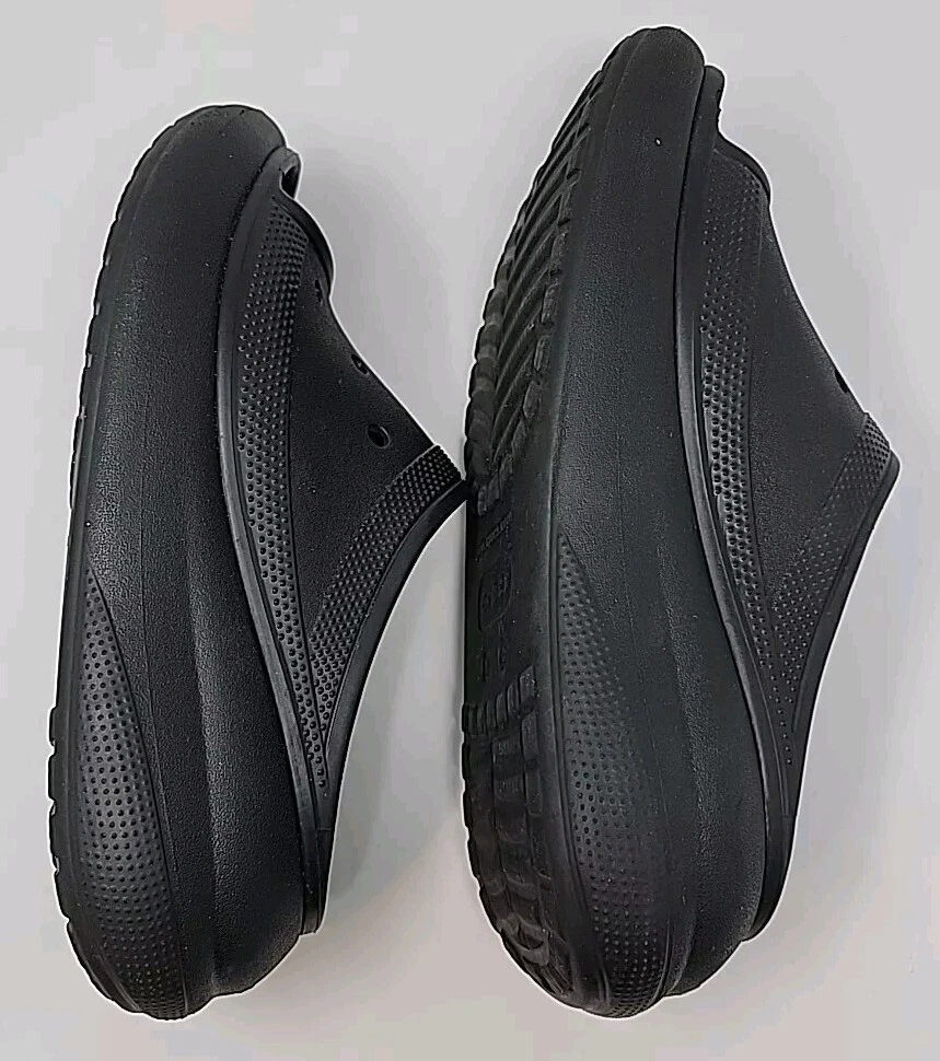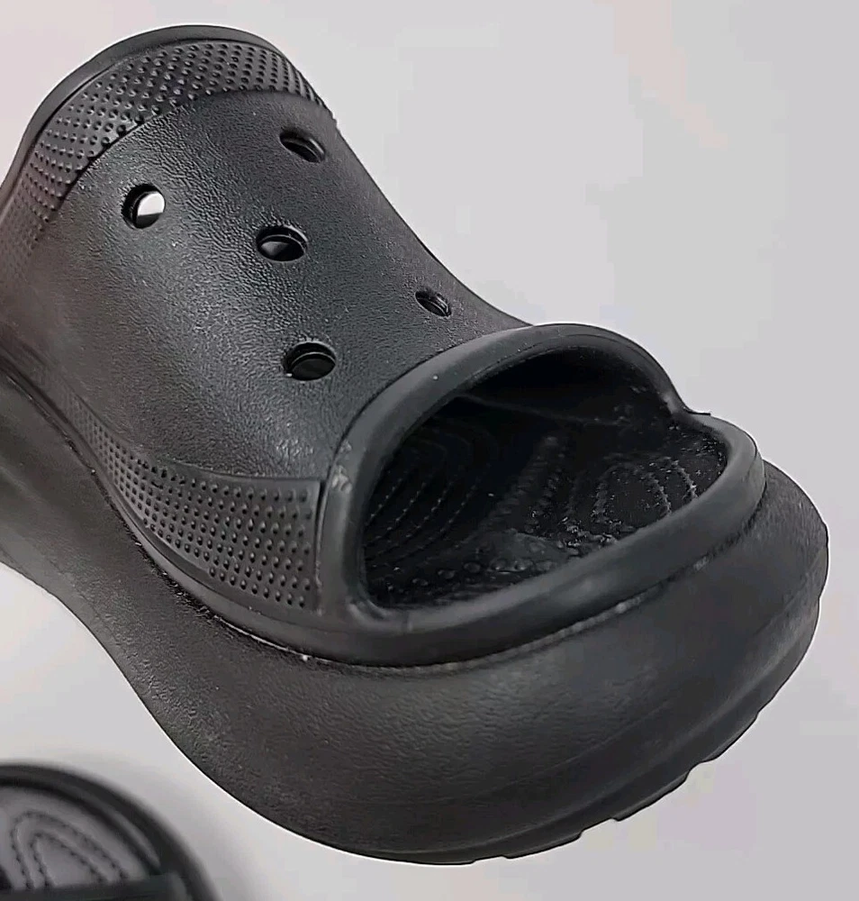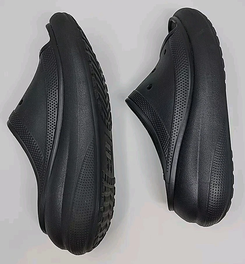 The Crocs Classic Crush Slide sandals in black are designed for both men and women in a unisex size 8. Featuring a slip-on style with a comfortable wedge heel, these platform sandals are perfect for casual wear. Made from rubber, these sandals offer a solid construction with a mid-height heel of 2-2.9 inches for added lift. The Crocs brand is known for its comfort, making these sandals a practical and stylish choice for everyday wear.