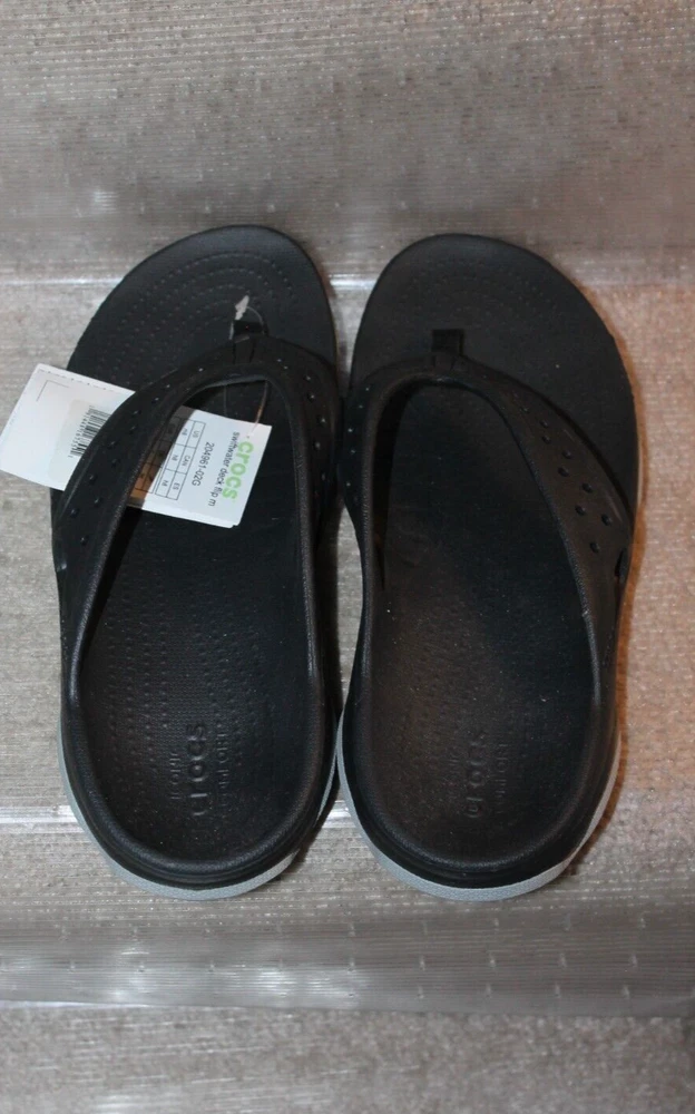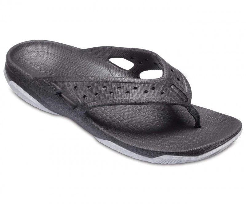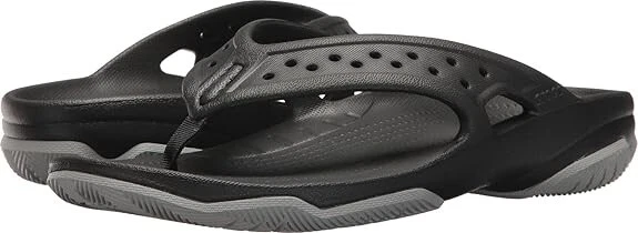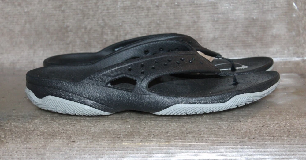 Elevate your summer style with these Crocs Swiftwater Deck Thong Flip Flop Sandals in Stucco. Perfect for any casual occasion, these sandals feature a comfortable thong design and a stylish flip flop closure. The black and light gray color combination is versatile and easy to pair with any outfit. Crafted with quality materials, these Crocs sandals are durable and built to last. The Swiftwater model is a fan favorite for its comfort and style. Whether you're headed to the beach, pool, or just out and about, these sandals are a must-have for any man's summer wardrobe.
