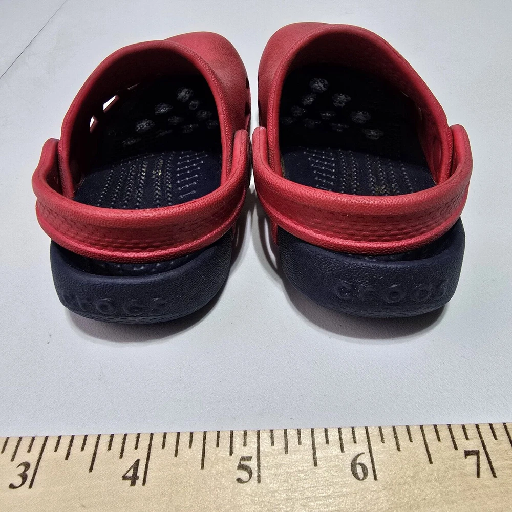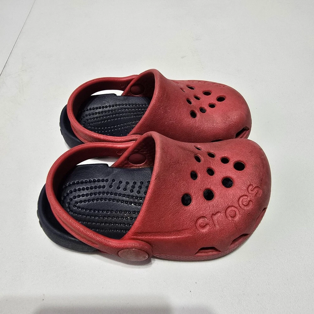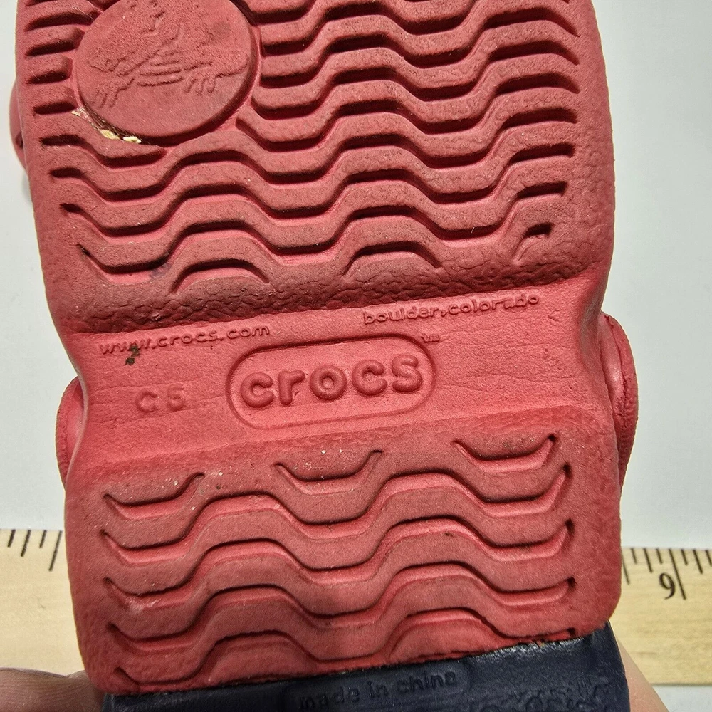 These Crocs slip-on clogs are perfect for your little one's casual summer, fall, or spring outings. The colorful red and blue design adds a fun touch to any outfit, while the rubber upper material ensures durability and comfort. These shoes are easy to slip on and off, making them convenient for busy parents and toddlers alike. The clogs come in a size 5C and are part of the Crocs brand, known for their quality and comfort. Whether your baby is playing outside or going to a park, these shoes are a great choice. Made in Mexico, they are a unique addition to your child's shoe collection.