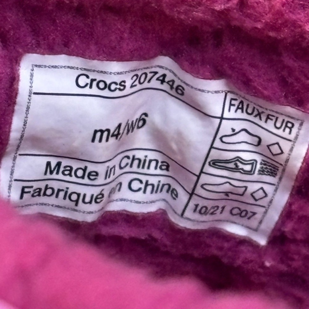 US Shoe Size: M4 W6 Seller Notes: “In good pre-owned condition. Smoke free home.” Department: Unisex Adults Color: Pink Country of Origin: China Brand: Crocs Style: Slip-On Upper Material: Faux Fur
