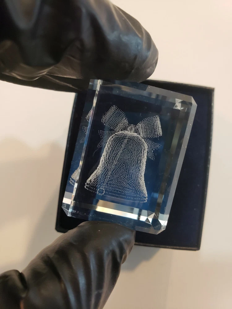 This crystal 3-D laser-etched glass cube is the perfect addition to your holiday décor collection. The cube features a beautiful holiday bell design that will catch the eye of anyone who sees it. Made of high-quality glass, this cube is not only beautiful but also durable and long-lasting. The clear color of the glass and the intricate details of the etching make this cube a unique and stunning piece. It is perfect for displaying on a mantel, shelf, or table during the holiday season. Whether you're looking to add to your own collection or give a special gift, this crystal glass cube is sure to impress. Box may have slight damage