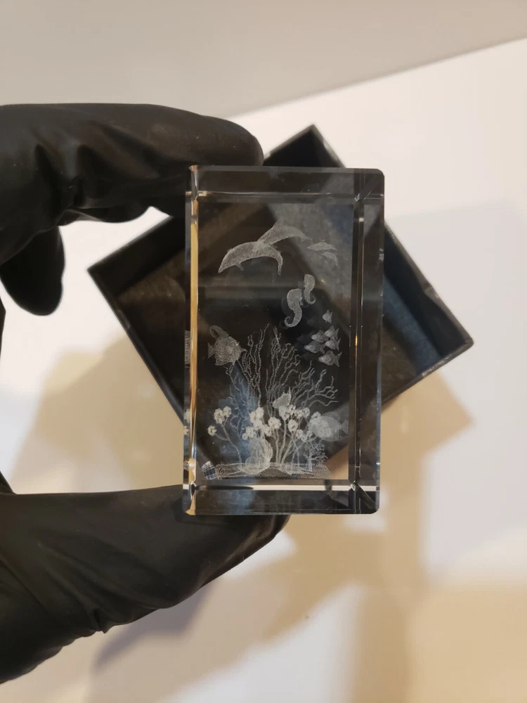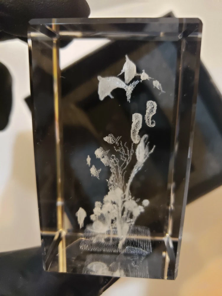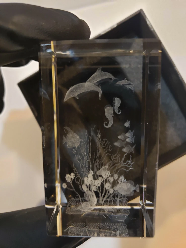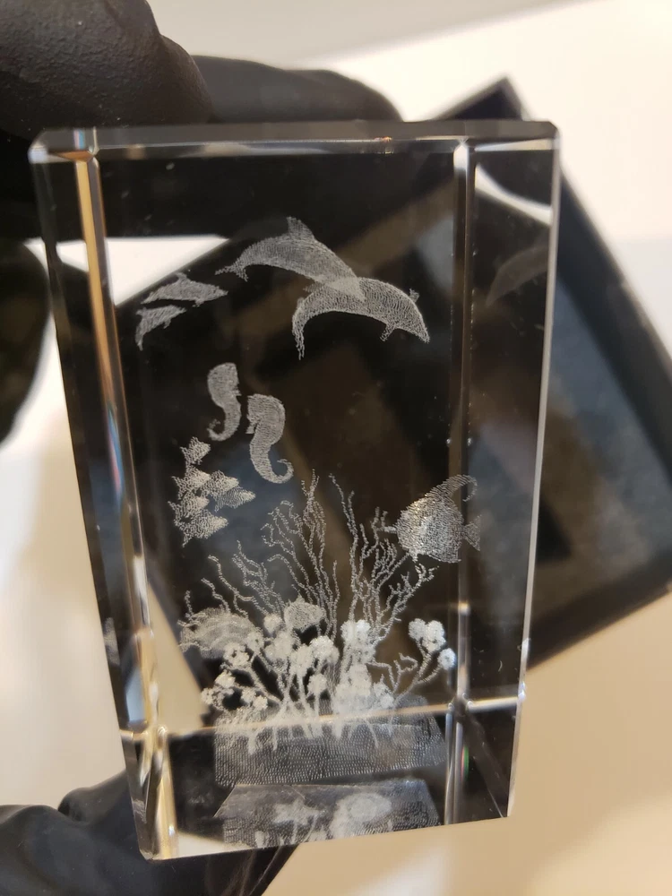 CRYSTAL 3-D LASER ETCHED GLASS CUBE dolphins seahorse ocean scene