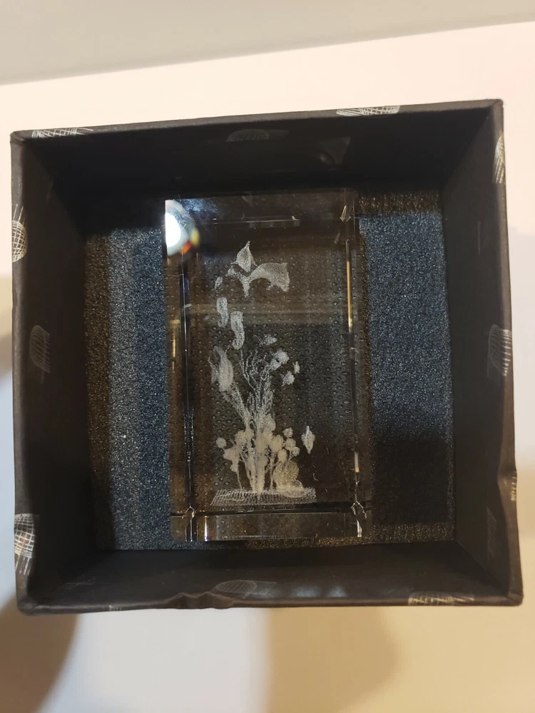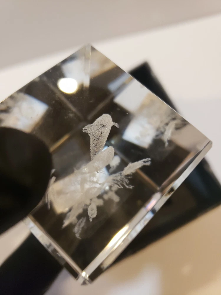 great gift glass crystal etched cube laser 3d box may have some damage but crystal in excellent condition great for display cabinet, desk top, paperweight, decoration, mantle, birthday gift present
