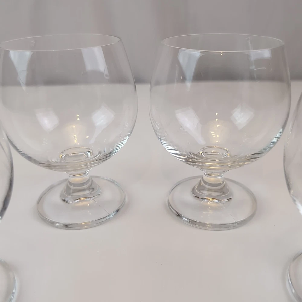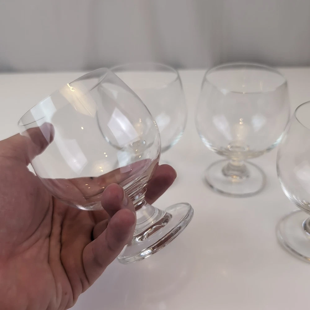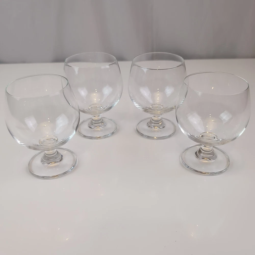 These elegant Crystal Brandy Snifters from France are a set of four round goblets perfect for all occasions. Each signed by the French manufacturer, these vintage pieces feature an etched design on clear crystal with a glossy finish. Standing at 4-1/2 inches tall and with an 11 oz capacity, these contemporary style snifters are perfect for enjoying brandy or other spirits in a sophisticated manner. The machine washable glassware is a stylish addition to any barware collection.