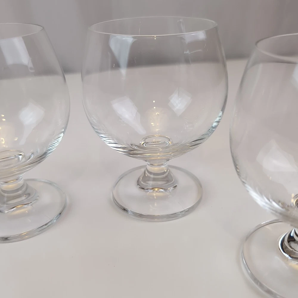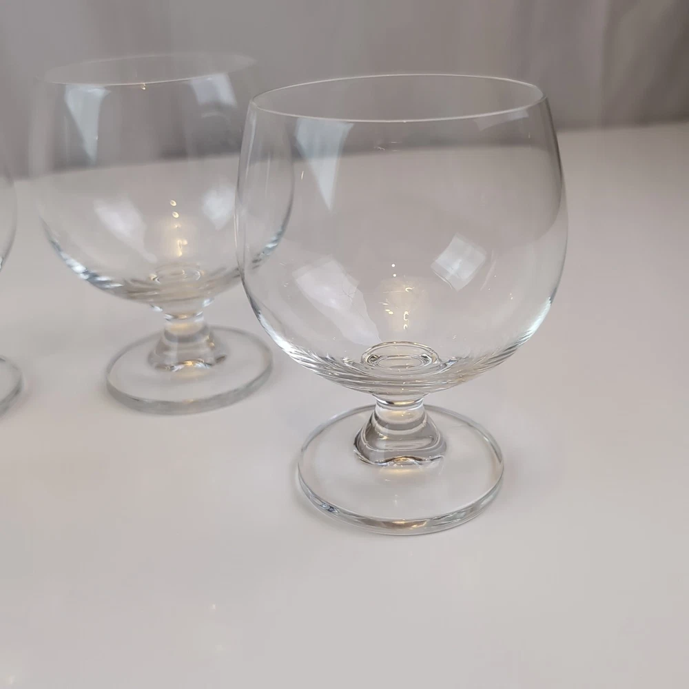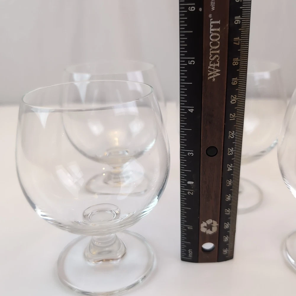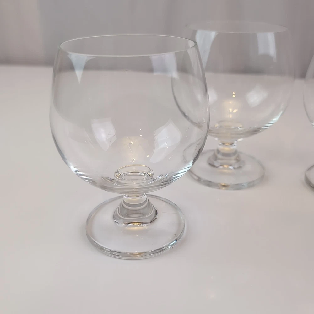 These elegant Crystal Brandy Snifters from France are a set of four round goblets perfect for all occasions. Each signed by the French manufacturer, these vintage pieces feature an etched design on clear crystal with a glossy finish. Standing at 4-1/2 inches tall and with an 11 oz capacity, these contemporary style snifters are perfect for enjoying brandy or other spirits in a sophisticated manner. The machine washable glassware is a stylish addition to any barware collection.