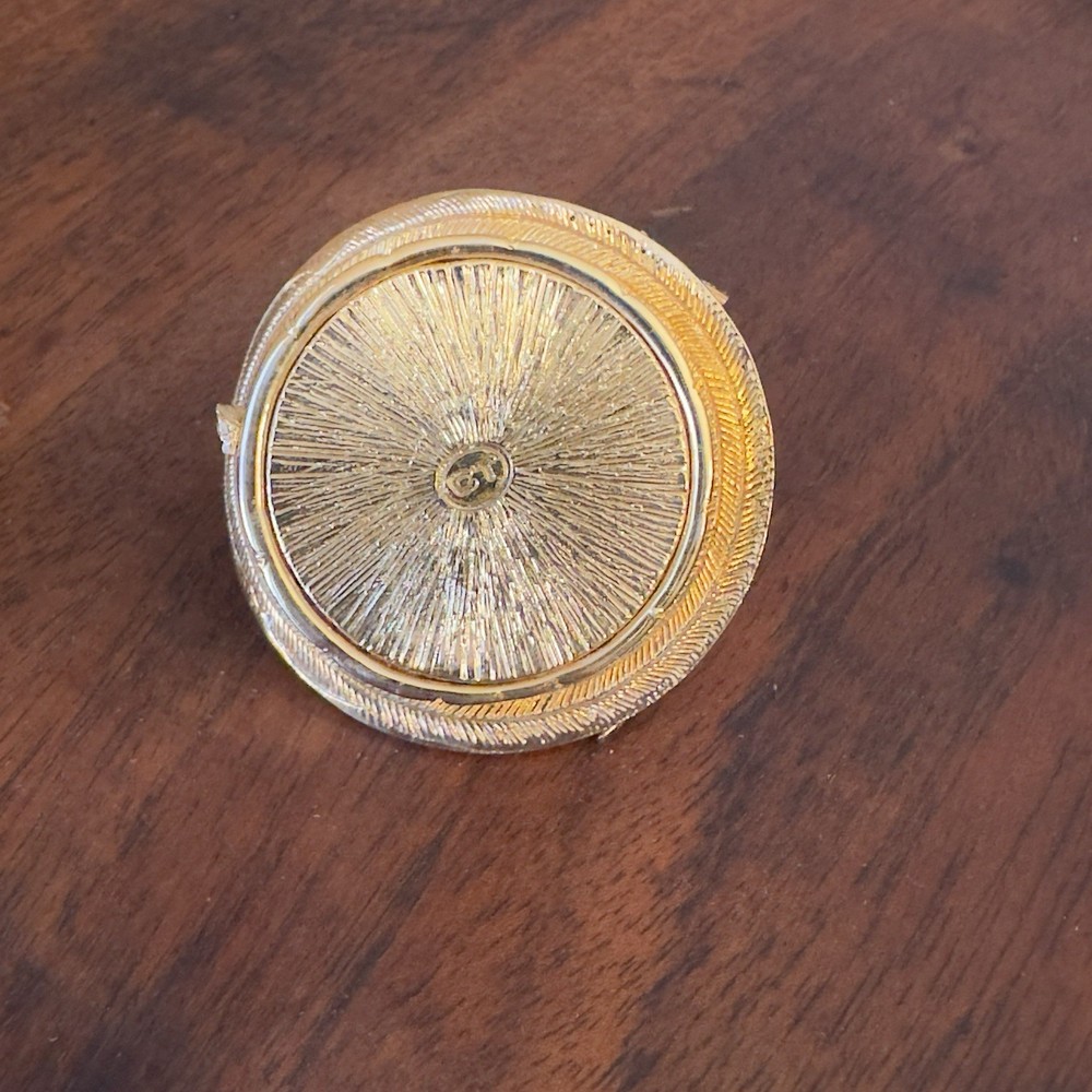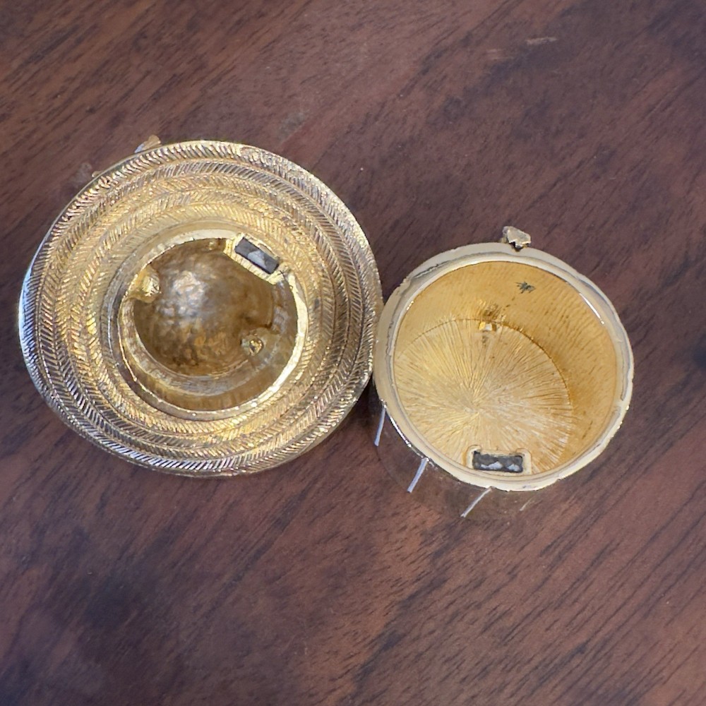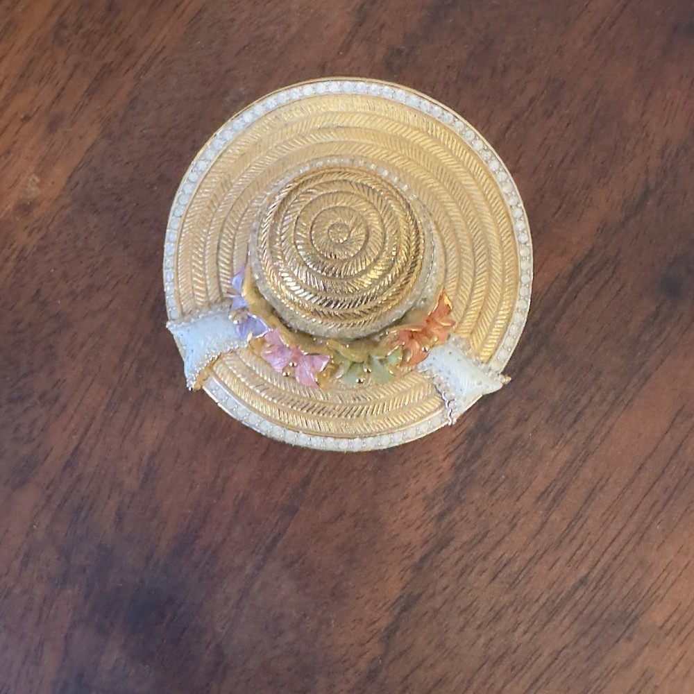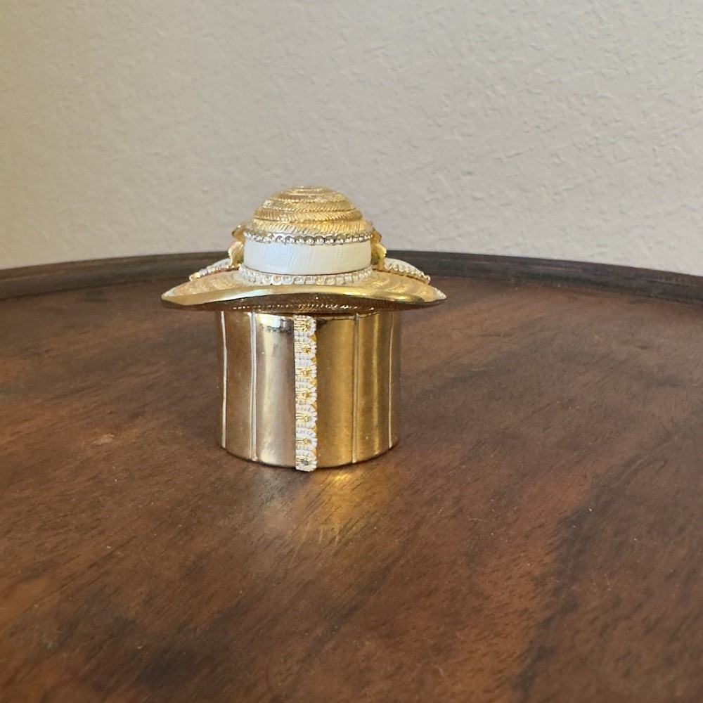 Add a touch of elegance to your home with this CT Metallic Rhinestone Jeweled Bird Cage Trinket Box. Its stunning design features a small, gold metal hat shape, adorned with sparkling rhinestones and a fluffy finish that captures the essence of a bygone era. The trinket box is beautifully accented with floral details and a magnetic closure that ensures your keepsakes are secure. This exquisite piece is not only a functional trinket box but also a charming decorative item that can enhance any room's aesthetic. Whether storing small treasures or displayed as a standalone piece, it brings a sophisticated vibe to your space. The unique subject matter and metallic finish make it a standout addition to your collection or as a thoughtful gift for someone special. Magnetic hinge is broken but can still be together with magnet.