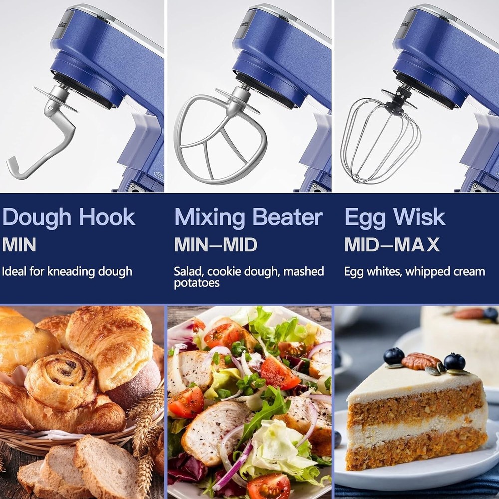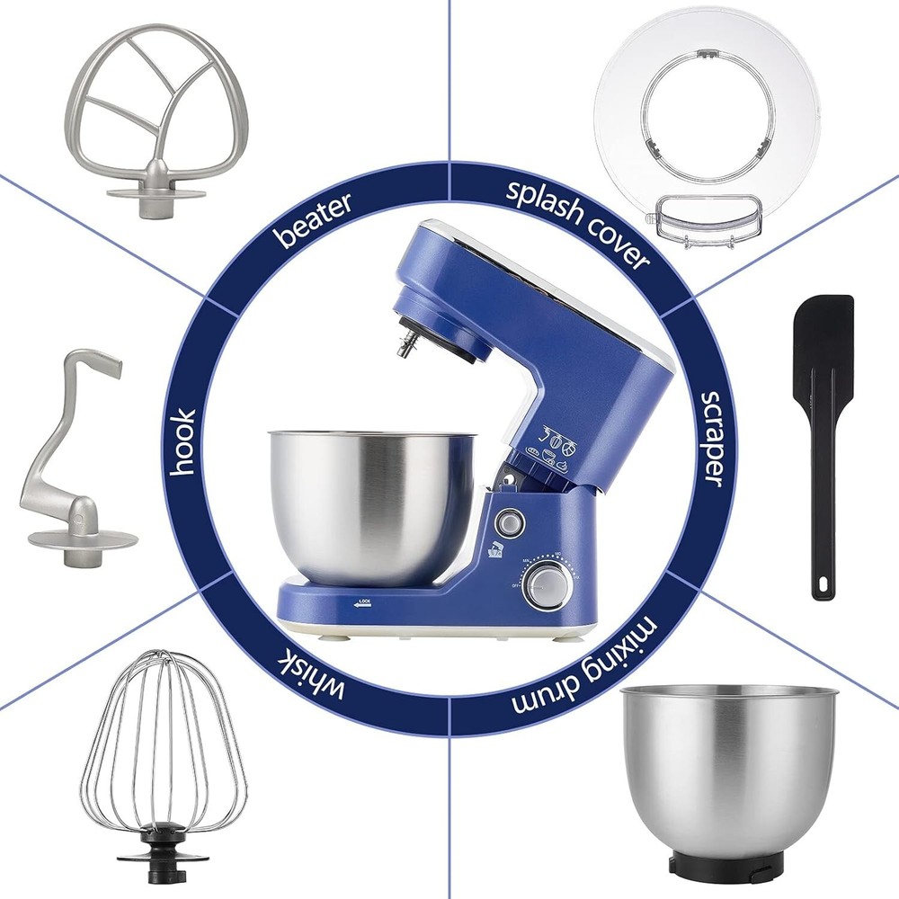 [UNIFORM MIXING]-CUSIMAX stand mixer has planetary mixing action for more even mixing results. The powerful motor with 3 variable speeds from slow stir to fast mix for kneading, mixing, beating, you can use this mixer creat a variety of recipes. [ENOUGH CAPACITY]-The electric mixer is equipped with 5Qt stainless steel bowl, providing enough capacity for bigger batches of baking, suitable for your family. Food-grade stainless steel bowl is easier to clean. The splash guard with access port helps add ingredients without making a mess, let you cook at great ease, enjoy to prepare homemade dishes. [MULTIPURPOSE ACCESSORIES]-The cake mixer comes with 4 different accessories including dough hook, beater, whisk and plastic spatula. Whether you make bread, pizza, cakes, cookies, muffins, salad, pudding or other delicacies, each of the accessories can help you. All accessories are Dishwasher Safe. [EASY TO USE]-The tilt-head design food mixer allows you to install or uninstall the bowl and accessories easily, so that you can clean conveniently after using. Anti-slip silicone suction cups keep the mixer steady. [CUSIMAX GUARANTEE]-CUSIMAX Stand Mixer is shipped with an 18-month warranty. If you have any questions during using, please feel free to contact us. We will try our best to help you and offer the best service to you.