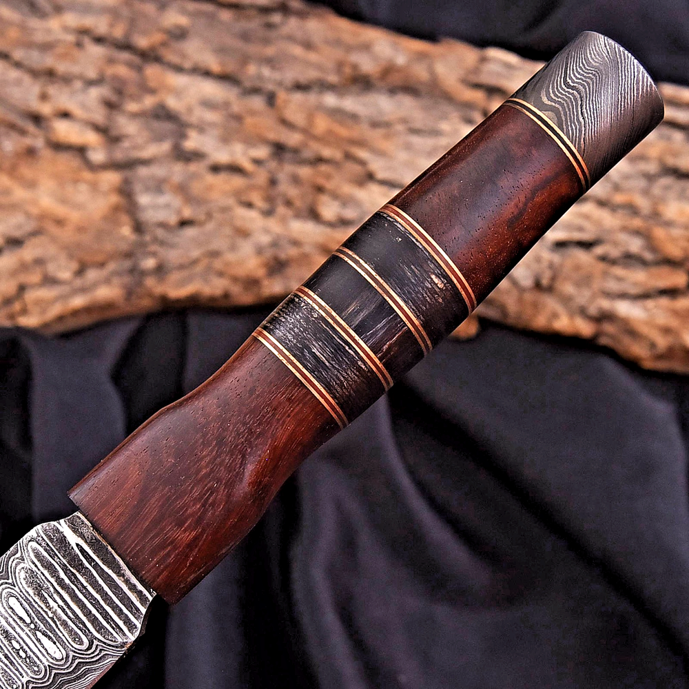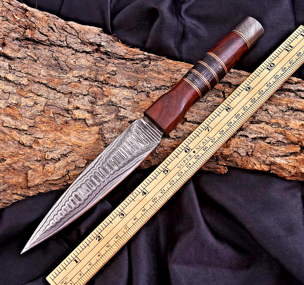 CUSTOM HAND MADE BOOT DAGGER HUNTING KNIFE FORGED DAMASCUS STEEL BLADE Wood Handle This superb design knife is hand forged. Blade of this knife has a nice file work and is made of 512 layers of 4340 stainless steel and 1075 high carbon steel and hardness 55-58 HRC . This robust knife is lab tested under intense conditions, the balance and shape of this knife ensures perfect grip. Overall Length: 11" Inches Blade Length: 6" Inches Handle Length: 5" Inches Damascus Design: Twist Pattern Layers: 512 Package Includes: with Leather Sheath Warning: Keep fingers clear of blades. Store away from children.