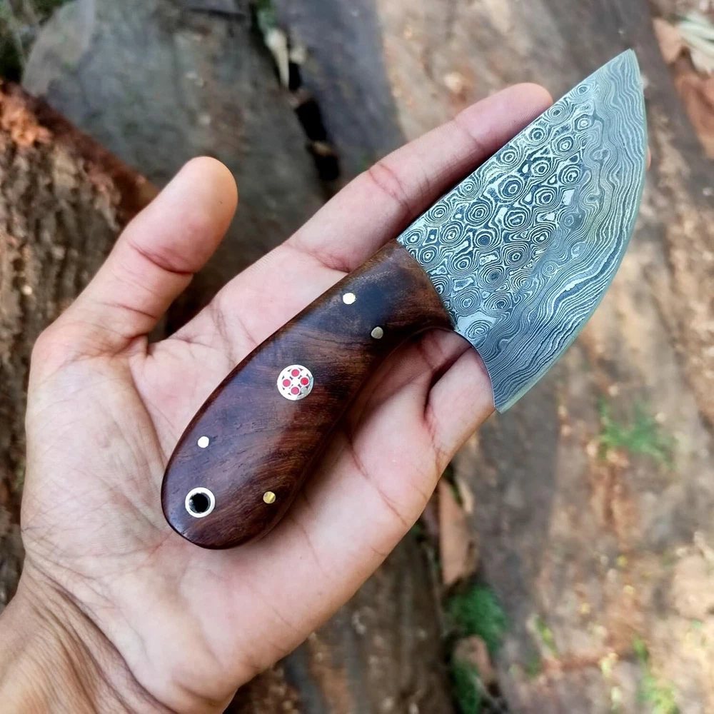 Handmade Damascus Skinner Knife, 6-Inch Fixed Blade with Leather Sheath – Hunting, Skinning, and EDC Knife Wood Handle Premium Damascus Steel Blade: Expertly crafted from high-quality Damascus steel, this 6.5-inch skinning knife offers exceptional sharpness, edge retention, and a unique rain drop pattern for enhanced durability. Overall Length of this damascus Hunting knife is 06.50 inches Blade Length is 03.50 inches Handle Length is 03.00 inches Blade Thickness is 4 mm. Full Tang Construction: Features a full tang design that ensures maximum strength, balance, and control, providing a reliable and durable blade for various outdoor tasks. High Edge Retention Blade, Hardness is 56±1 HRC. Real Damascus Steel Forged By Hammer Machine From 15n20 and 1095 Steels , 10 degree Angle sharpening. Perfect for Skinning & Hunting: The 3.5-inch blade is designed specifically for skinning and field dressing, making it the ideal tool for hunters, outdoor enthusiasts, and survivalists. Ergonomic Handle for Comfort: The comfortable, non-slip rosewood handle ensures a secure grip for precision cuts, reducing hand fatigue during long outdoor sessions Premium Leather Sheath: Comes with a high-quality leather sheath for safe storage and easy access, ensuring your knife is always ready when you need it.