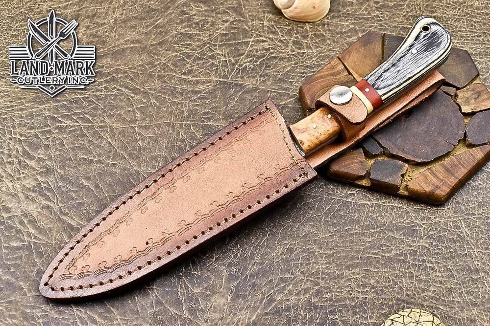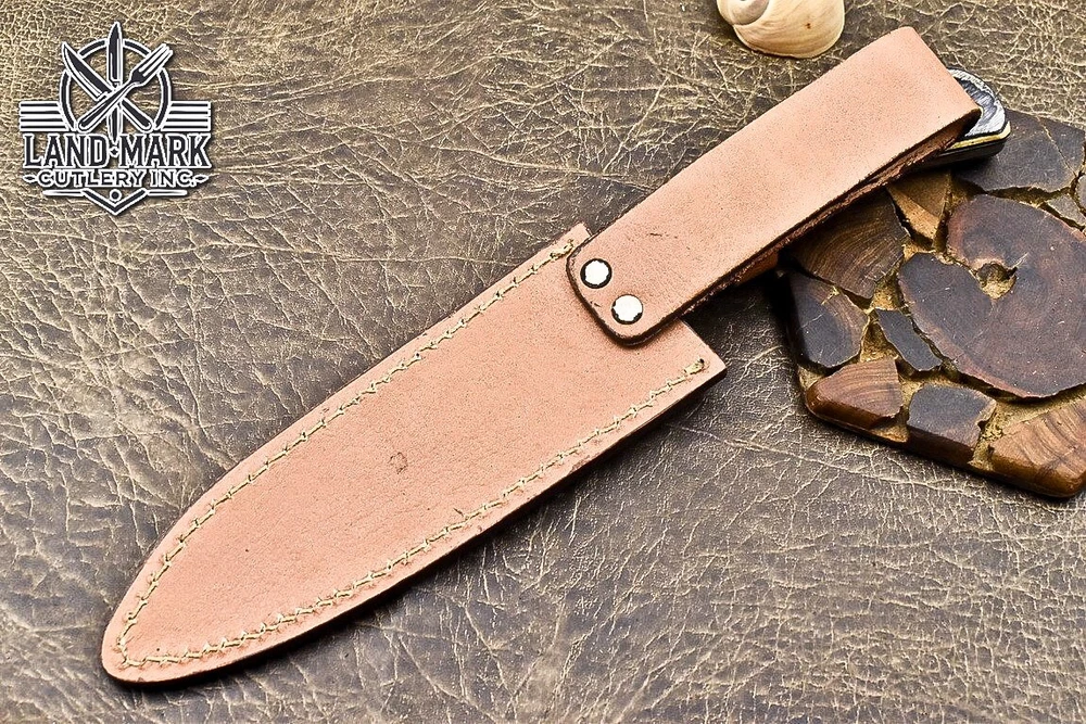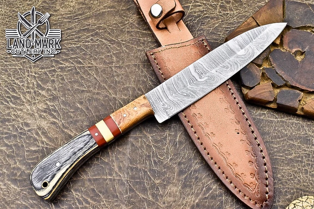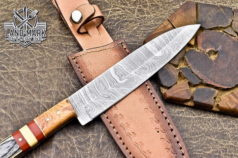 Custom Hand Made DAMASCUS STEEL KITCHEN CHEF KNIFE WITH PAKKA WOOD HANDLE We offer a shipping discount for More then one purchased . And discount will be apply on combine invoice, Discount will not apply on separate payment. ITEM DETAILS OVER ALL LENGTH 14.0 inches long (Approx) HANDLE LENGTH 5.0 inches long (Approx) BLADE LENGTH 9.0 inches long (Approx) BLADE HARDNESS 58-60 HRC Which Holds The Sharp Edge For Long Time. HANDLE PAKKA WOOD COVER LEATHER SHEATH This Awesome custom made KNIFE has a nice hand forged with the combination of 4340 & 1080 steel. HOW OUR DAMASCUS IS MADE: All our Damascus is real and not just an acid etch. Damascus is a mixture of 1080HC and 4340 nickel carbon. You heat them up together and then fold the bar over and over to get the desired layers, ours are 396 layers. Then you burn the blade in acid, and it turns the nickel satin color and the high carbon turns blackish gray. This is how the layers are exposed to show the layers of the new steel created coined "Damascus". All Damascus is acid etched to show the layers. If you high polish the metal it will be shinny satin like all steels. Only after you burn the sides of the blade with acid do you see the layers of the two steels. Makes sense? After we make our knives we high polish the handles and put an edge on the blade. The high polishing buffs off the acid burned layer of the handle, and the blade edge is sharpened and the acid burned edge becomes satin. You can re-burn the tang of the blade near the handles and the edge of the blade and it will show the layers once more. All our knives are hand made, durable and unique ***** YOU WILL RECEIVED THE SAME KNIFE Qality Standards Our Damascus blades are made from high quality non-stainless steels which rival or exceed any Damascus blade made from the 10 series with 4340. Our Damascus combination has taken years to perfect and has been tested under a variety of application which will offer professional performance in categories of toughness, strength (lateral stress) and edge honing and holding ability. In a 5 spot Rockwell test our blades will average near or close to 58 which offers a perfect balances between its toughness and strength.Our blades due to carbon content need to be regularly treated with wax and/or 3 in 1 oil to maintain its superior quality. Questions if you have any question feel free to send us message we aim to answer all questions within 24 hours Feedback If you are not satisfied with our service please contact us before leaving any negative or natural feedback. We will resolve all issues as quickly as possible. Disclaimer We are not responsible for any injuries associated with the use of our tools. Our products are intended for legal use only by responsible buyers. Therefore, we will not sell our products to anyone under the age of 18. Before bidding please check your country laws as some countries Custom don't allow this. If your purchase is held by Custom Authorities in your country/State we will not be responsible for that and no refund will be issued Shipping We offer a 20% shipping discount for More then one purchased . And discount will be apply on combine invoice, Discount will not apply on separate payment We ship within 24 hours after receiving complete payment but this can be delayed due to week ends or Governments and Religious Festivals . . This is beyond our control and we apologize for this inconvenience. Precautions Our Tools are very sharp so open and use them very carefully We are not responsible for any injuries associated with the use of our tools Tips to Care knife 1. NEVER STORE YOUR KNIFE FOR LONG TIME IN LEATHER SHEATH. 2. LEATHER CAN ABSORB WATER, WHICH WILL RUST THE KNIFE. 3. ALWAYS CLEAN THE BLADE AFTER USING WITH OIL OR WAX