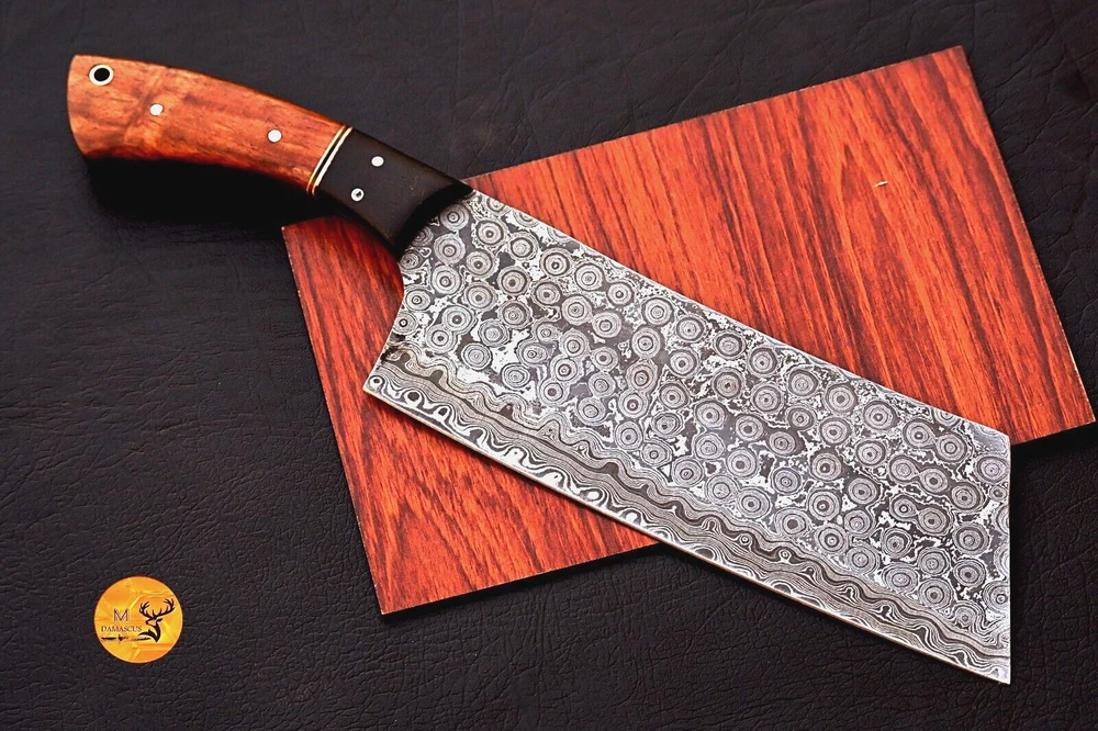 FULL TANG CUSTOM HANDMADE FORGED DAMASCUS STEEL BUTCHER KNIFE CLEAVER MEAT CHOPPER Wood Handle This superb design knife is hand forged. Blade of this knife has a nice file work and is made of 512 layers of 4340 stainless steel and 1075 high carbon steel and hardness 55-58 HRC . This robust knife is lab tested under intense conditions, the balance and shape of this knife ensures perfect grip. Overall Length: 12" Inches Blade Length: 7.5" Inches Handle Length: 4.5" Inches Damascus Design: Rain Drop Pattern Layers: 512 Hand Forged Hardness: 55-58 HRC Care Instructions: Keep the knife dry after each cleaning. Warning: Take care when removing product from packaging. Keep fingers clear of blades. Store away from children.
