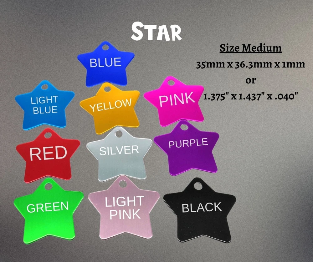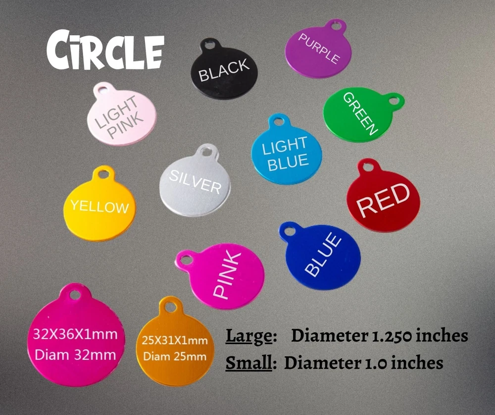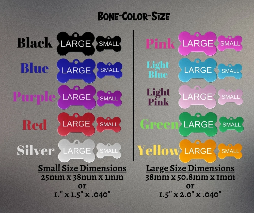 CUSTOM ENGRAVED PERSONALIZED PET TAG ID DOG CAT NAME TAGS DOUBLE SIDE. Condition is "New". Shipped with USPS First Class. Small Tag Size: 1 inch x 1.5 inches x .039 inches thick or 25.4 mm x 38.1 mm x 1 mm thick (see picture) Ring Size: 1/2" diameter Large Tag Size: 1.5 inch x 2.0 inches x .039 inches thick or 38.1 mm x 50.8 mm x 1 mm thick (see picture) Ring Size: 1/2" diameter BONE SHAPE TAG WITH RING INCLUDED Letters will be laser engraved, they won't fade out. 10 COLORS TO CHOOSE For engrave information please make sure to type it after you buy it. if the box to enter the info is not showing, please send message. Please use the "Message to Seller" to let us know as follows" -front side - (letters or numbers you want us to engrave) -back side - (letters or numbers you want us to engrave) (the FEWER letters you use the BIGGER AND CLEAR the engrave will be) If order its placed during business hours before noon, please gave us a couple of hours to do the engrave and we will take it to mail box same day , if the order its placed at night, at afternoon or over the weekend we will take it to the post office on the next business hours. Regular addresses allow 3 to 5 days for delivery. Non regular may take up to 15 days It will be shipped in a letter size envelope Via USPS First Class Mail. Tracking Number will be provided only when buying 6 or more tags. Local pick up? Ok.