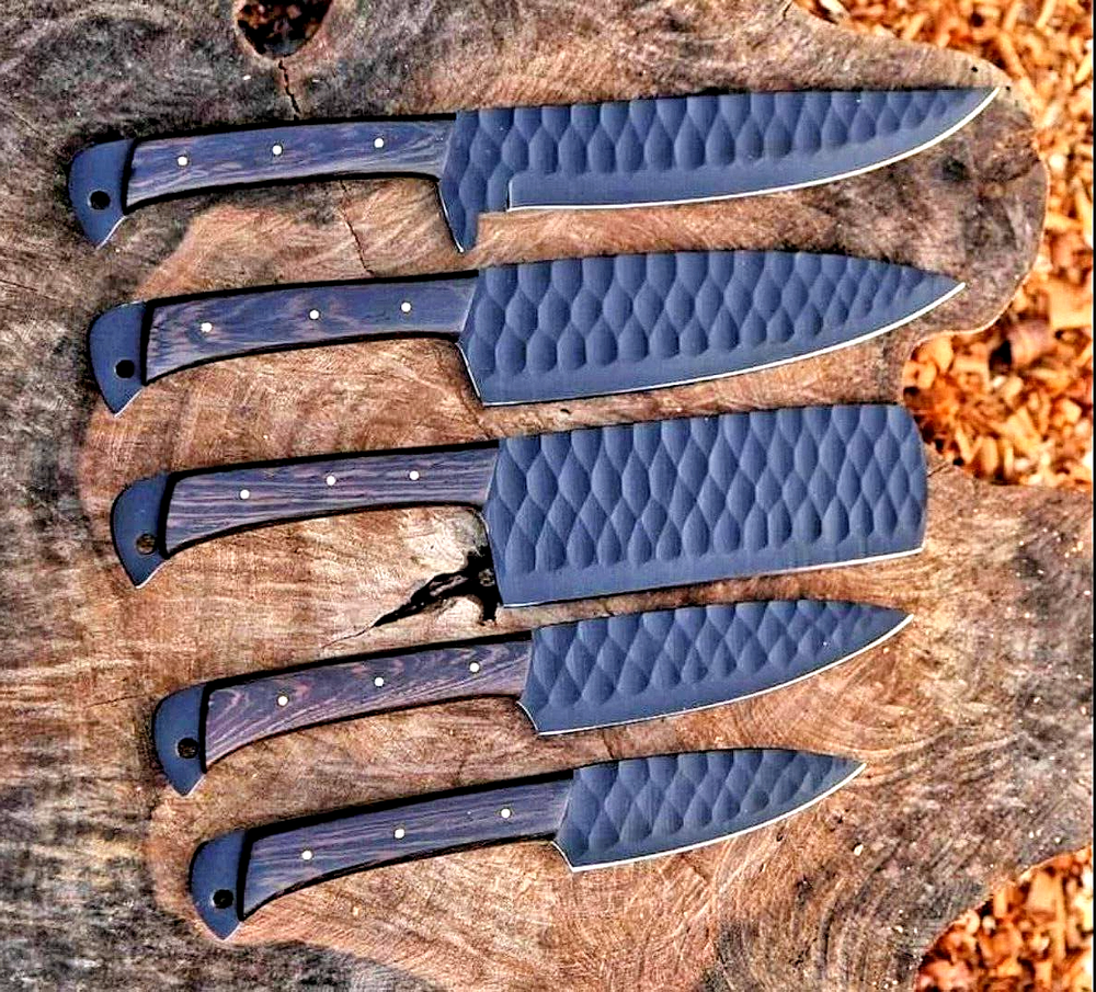 CUSTOM HAND MADE CARBON STEEL BLADE CHEF KNIFE KITCHEN KNIVES SET Wood Handle This superb design knifes is hand made. Blade of this knife has a nice file work and is made of high carbon steel and hardness 55-58 H R C . This robust knife is lab tested under intense conditions, the balance and shape of this knife ensures perfect grip. Overall Pieces : 5 Cleaver Knife : Blade 6" Inches - Handle 4.75" Inches Fillet Knife : Blade 7.25" Inches - Handle 4.75" Inches Chef Knife : Blade 6.5" Inches - Handle 4.75" Inches Paring Knife : Blade 3.5" Inches - Handle 4.5" Inches Steak Knife : Blade 4.5" Inches - Handle 4.5" Inches Package Includes: with Leather Sheath Bag Warning: Keep fingers clear of blades. Store away from children.