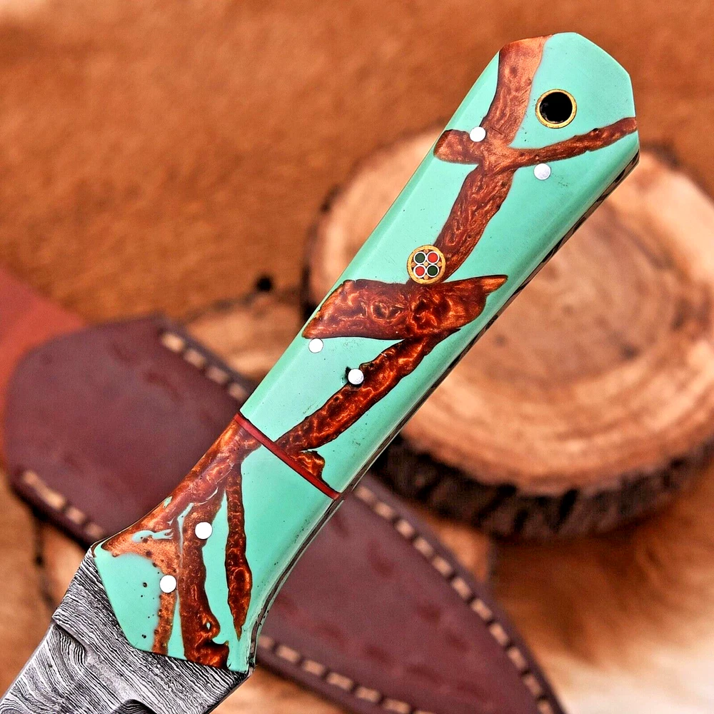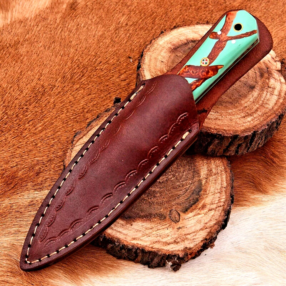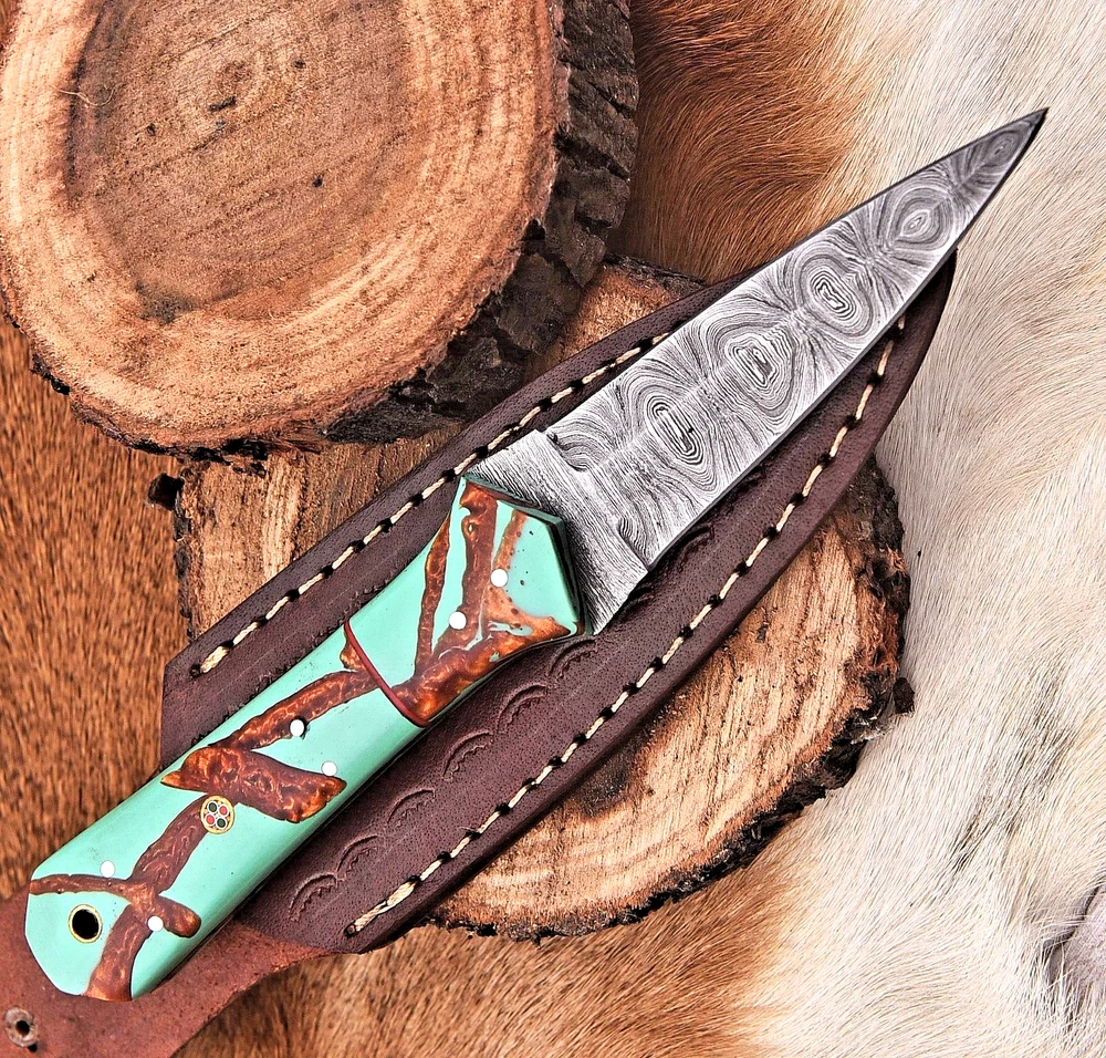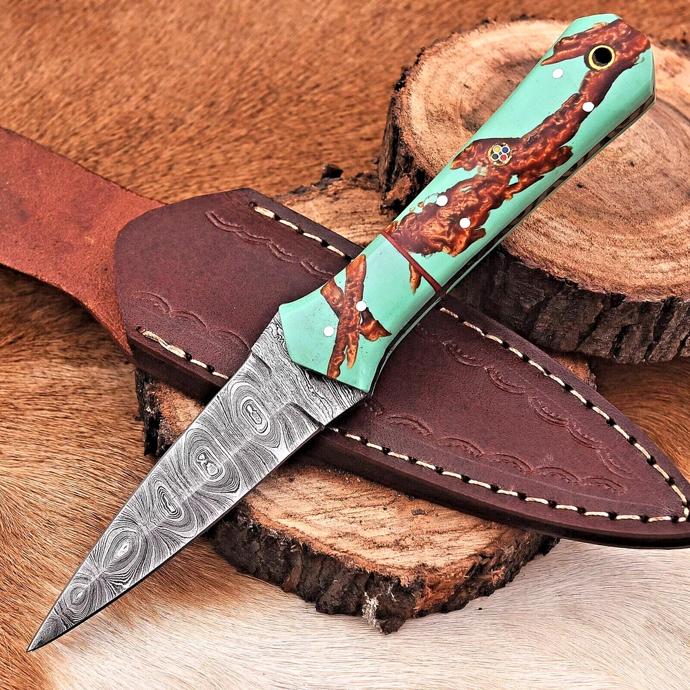CUSTOM HAND MADE HAND FORGED DAMASCUS STEEL BOOT KNIFE HUNTING CAMPING SURVIVAL Resin Handle This superb design knife is hand forged. Blade of this knife has a nice file work and is made of 512 layers of 4340 stainless steel and 1075 high carbon steel and hardness 55-58 HRC . This robust knife is lab tested under intense conditions, the balance and shape of this knife ensures perfect grip. Overall Length: 9" Inches Blade Length: 4" Inches Handle Length: 5" Inches Damascus Design: Twist Pattern Layers: 512 Package Includes: with Leather Sheath Warning: Keep fingers clear of blades. Store away from children.