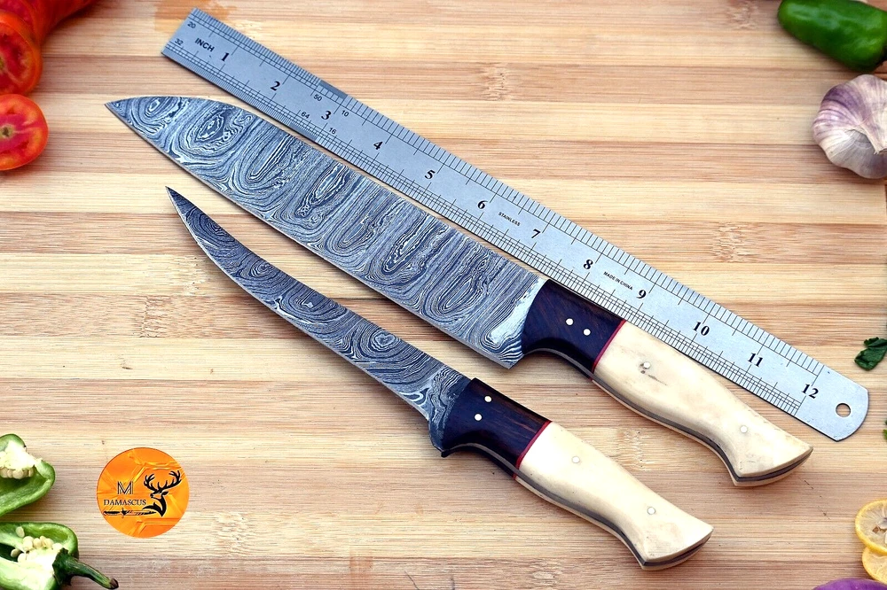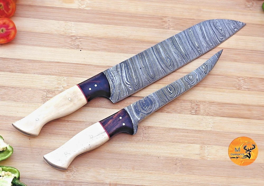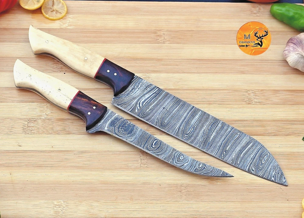 Blade Length: 7.5" INCHES Blade Edge: Straight Handle Material: CAMEL BONE & WOOD HANDLE MPN: N/A Brand: M DAMASCUS Type: Chef's Knife Set Includes: Bread Knife, Fillet & Larding Knives Custom Bundle: Yes Food Compatibility: Vegetable, Candy, Cheese, Fruit, Meat, Salad, Universal Making Method: Compressor Material: Damascus Steel Personalize: No Color: white & brown handle Number of Items in Set: 2 Features: With Handles