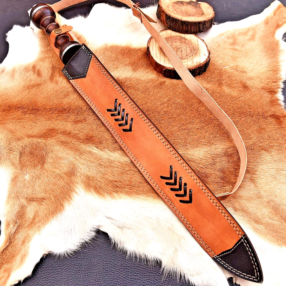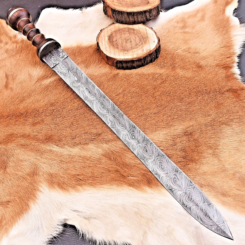 CUSTOM HANDMADE FORGED DAMASCUS STEEL SWORD Cocobolo Wood & Camel Bone With Damascus Steel Bolster Handle This superb design Sword is hand forged. Blade of this Sword has a nice file work and is made of 512 layers of 4340 stainless steel and 1075 high carbon steel and hardness 55-58 HRC . This robust Sword is lab tested under intense conditions, the balance and shape of this Sword ensures perfect grip. Overall Length: 25" Inches Blade Length: 18.5" Inches Handle Length: 6.5" Inches Damascus Design: Twist Pattern Layers:512 Package Includes: with Leather Sheath Warning: Keep fingers clear of blades. Store away from children.