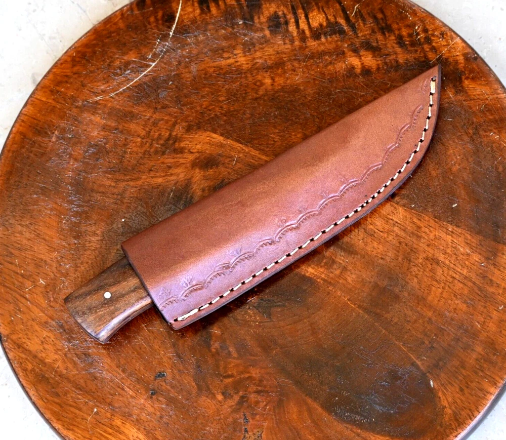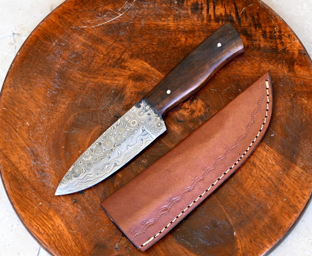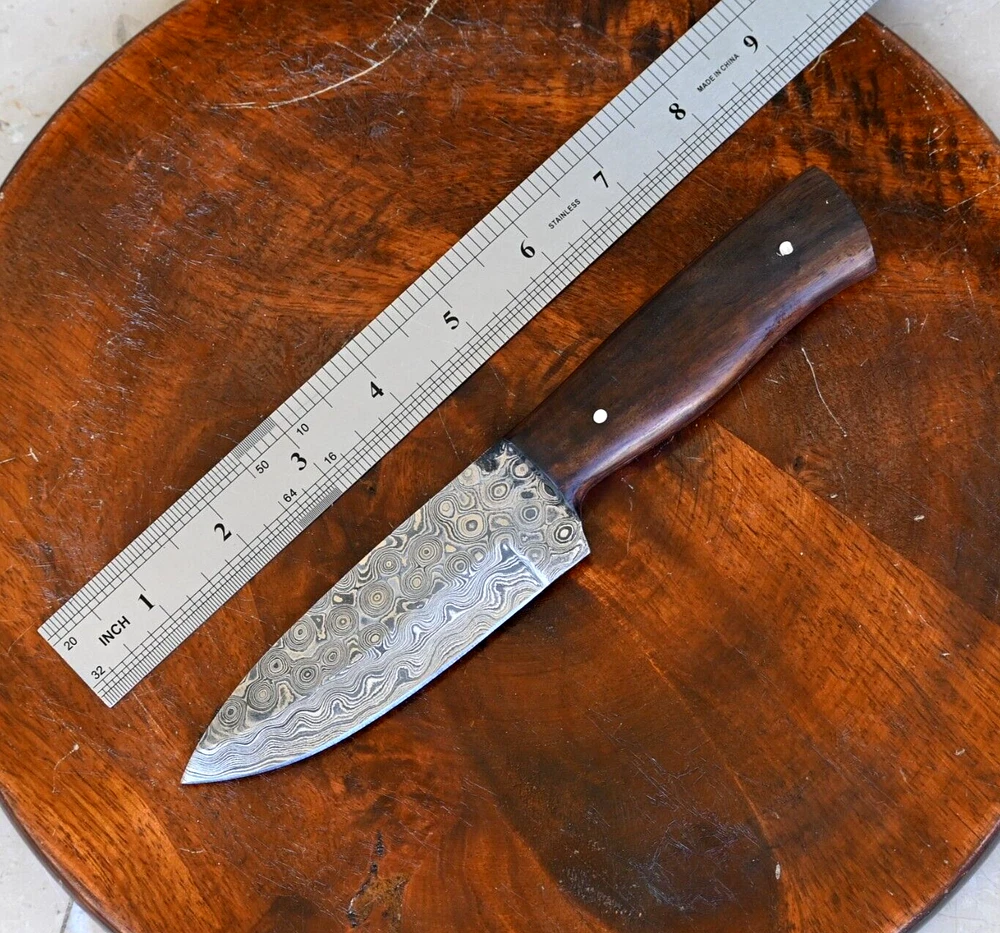 CUSTOM MADE HAND FORGED DAMASCUS STEEL SKINNER KNIFE HUNTING CAMPING SURVIVAL HIKING KNIFE Wood Handle This superb design knife is hand forged. Blade of this knife has a nice file work and is made of 512 layers of 4340 stainless steel and 1075 high carbon steel and hardness 55-58 HRC . This robust knife is lab tested under intense conditions, the balance and shape of this knife ensures perfect grip. Overall Length: 8.25" Inches Blade Length: 4.25" Inches Handle Length: 4" Inches Damascus Design: Rain Drop Pattern Layers: 512 Package Includes: with Leather Sheath Warning: Keep fingers clear of blades. Store away from children.