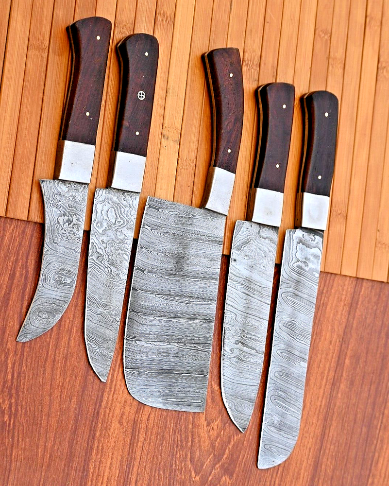 CUSTOM HAND MADE CHEF KNIFE SET HAND FORGED DAMASCUS STEEL BLADE Wood & Steel Bolster Handle This superb design knifes is hand forged. Blade of this knife has a nice file work and is made of 512 layers of 4340 stainless steel and 1075 high carbon steel and hardness 55-58 H R C . This robust knife is lab tested under intense conditions, the balance and shape of this knife ensures perfect grip. Overall Pieces : 5 Bread Knife : Blade 8" Inches - Handle 4.5" Inches Cleaver Knife : Blade 6.5" Inches - Handle 4.5" Inches Chef Knife : Blade 7" Inches - Handle 4.5" Inches Steak knife : Blade 5.5" Inches - Handle 4.5" Inches Paring Knife : Blade 4.5" Inches - Handle 4" Inches Damascus Design: Twist Pattern Layers:512 Care Instructions: Keep the knife dry after each cleaning. Warning: Keep fingers clear of blades. Store away from children.