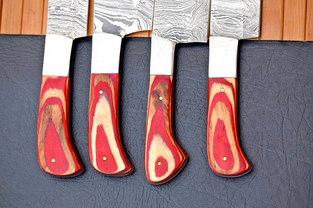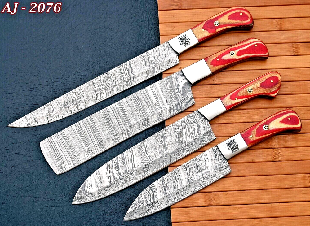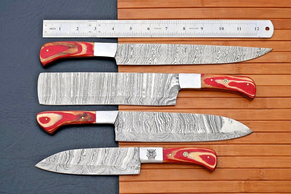 Features: With Handles Type: Chef's Knife Material: DAMASCUS STEEL BLADE Color: Black Making Method: Compressor MPN: N/A Number of Items in Set: 4 Handle Material: WOOD & STEEL BOLSTER HNADLE Blade Edge: VERY SHARP Personalize: No Food Compatibility: Fruit, Meat, Salad, Universal, Vegetables Set Includes: Butcher Knife, Butter Knife, Carving & Slicing Knives, Chef's Knife, Cleaver, Santoku Knife, Steak Knife, Utility Knife, Vegetable Knife Brand: M DAMASCUS Blade Length: 5"INCHES TO 8"INCHES