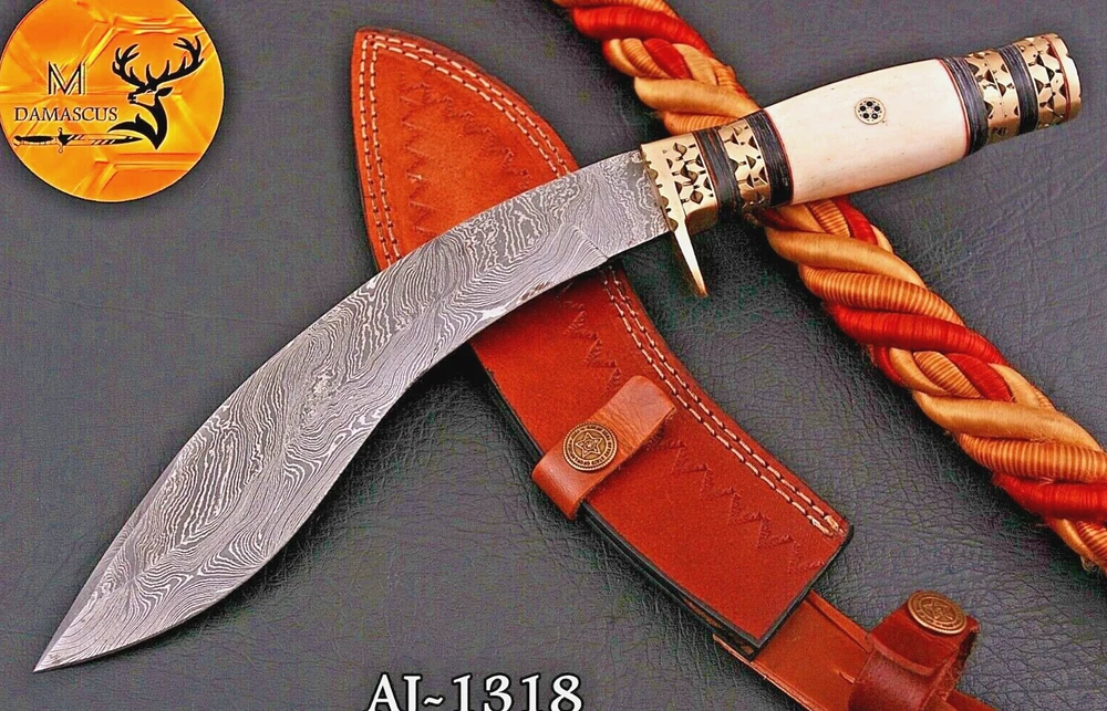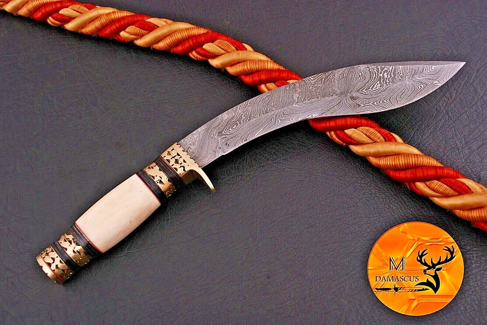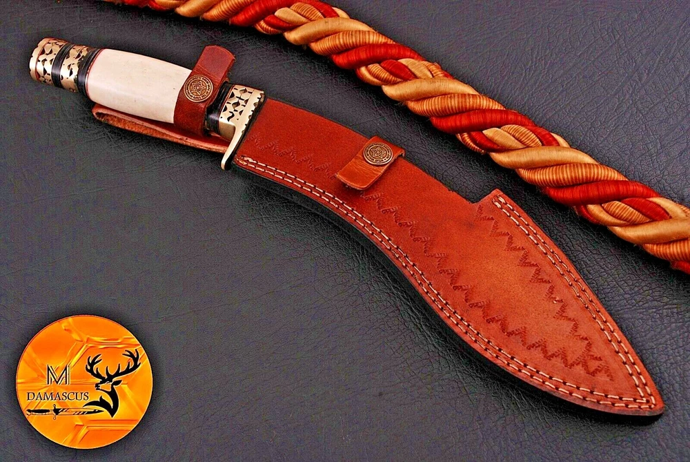 CUSTOM HAND MADE KUKRI KNIFE HAND FORGED DAMASCUS STEEL BLADE Camel Bone & Brass Guard Handle This superb design knife is hand forged. Blade of this knife has a nice file work and is made of 512 layers of 4340 stainless steel and 1075 high carbon steel and hardness 55-58 HRC . This robust knife is lab tested under intense conditions, the balance and shape of this knife ensures perfect grip. Overall Length: 13" Inches Blade Length: 8.5" Inches Handle Length: 4.5" Inches Damascus Design: Twist Pattern Layers: 512 Package Includes: with Leather Sheath Care Instructions: Keep the knife dry after each cleaning. Warning: Keep fingers clear of blades. Store away from children.