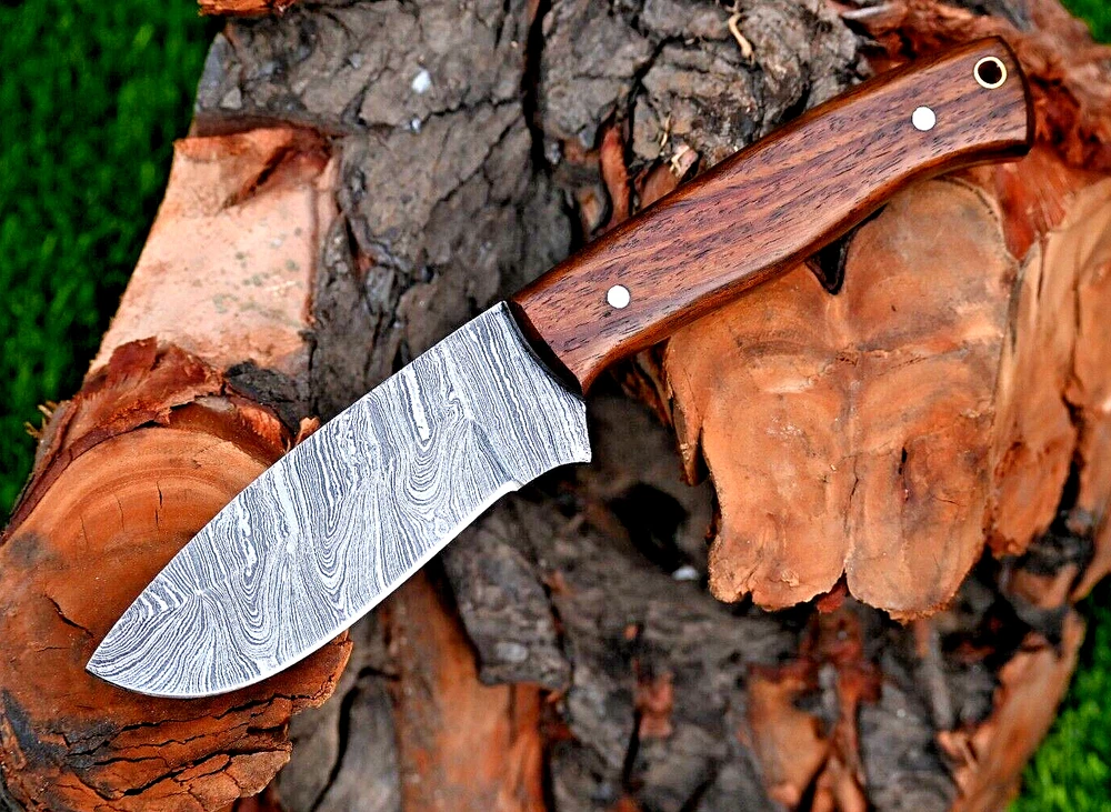 CUSTOM MADE HAND FORGED DAMASCUS STEEL SKINNER KNIFE HUNTING CAMPIN SURVIVAL HIKING KNIFE Wood Handle This superb design knife is hand forged. Blade of this knife has a nice file work and is made of 512 layers of 4340 stainless steel and 1075 high carbon steel and hardness 55-58 HRC . This robust knife is lab tested under intense conditions, the balance and shape of this knife ensures perfect grip. Overall Length: 9" Inches Blade Length: 5" Inches Handle Length: 4" Inches Damascus Design: Rain Drop Pattern Layers: 512 Hardness: 55-58 HRC Package Includes: with Leather Sheath Warning: Keep fingers clear of blades. Store away from children.