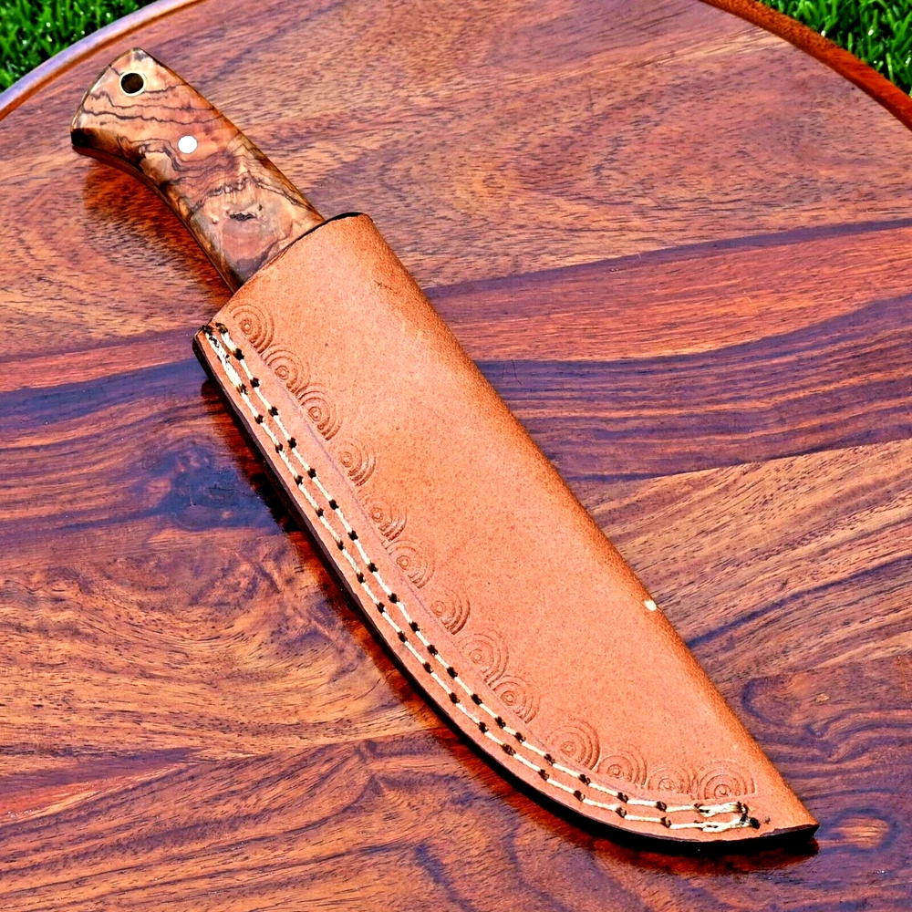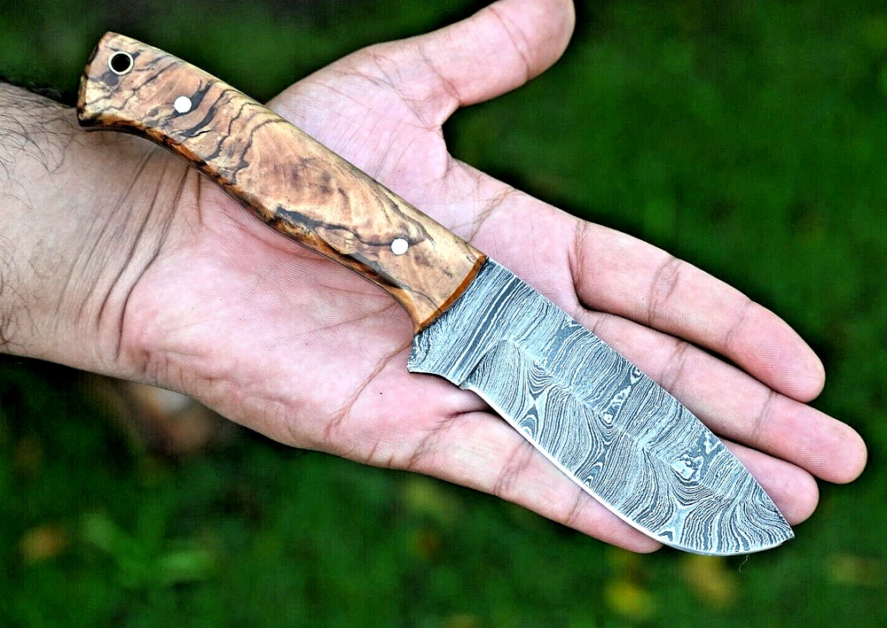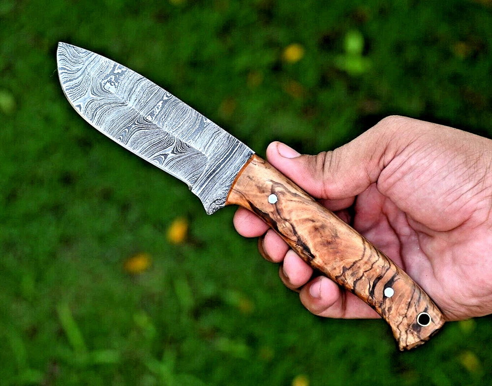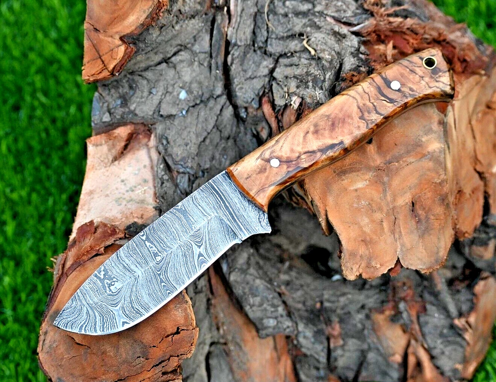 CUSTOM MADE HAND FORGED DAMASCUS STEEL SKINNER KNIFE HUNTING CAMPIN SURVIVAL HIKING KNIFE Wood Handle This superb design knife is hand forged. Blade of this knife has a nice file work and is made of 512 layers of 4340 stainless steel and 1075 high carbon steel and hardness 55-58 HRC . This robust knife is lab tested under intense conditions, the balance and shape of this knife ensures perfect grip. Overall Length: 9" Inches Blade Length: 5" Inches Handle Length: 4" Inches Damascus Design: Rain Drop Pattern Layers: 512 Hardness: 55-58 HRC Package Includes: with Leather Sheath Warning: Keep fingers clear of blades. Store away from children.