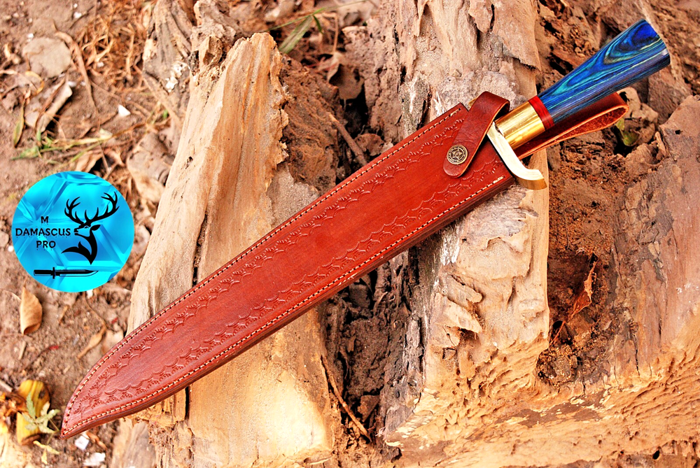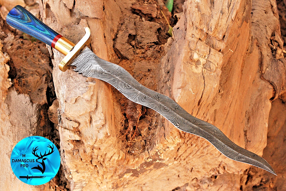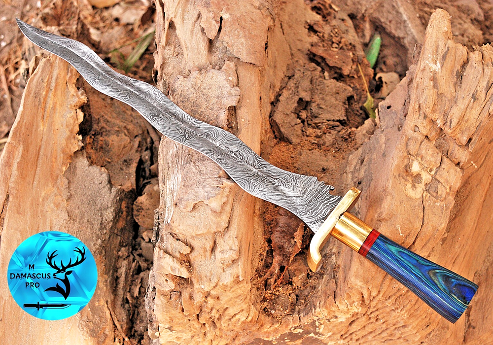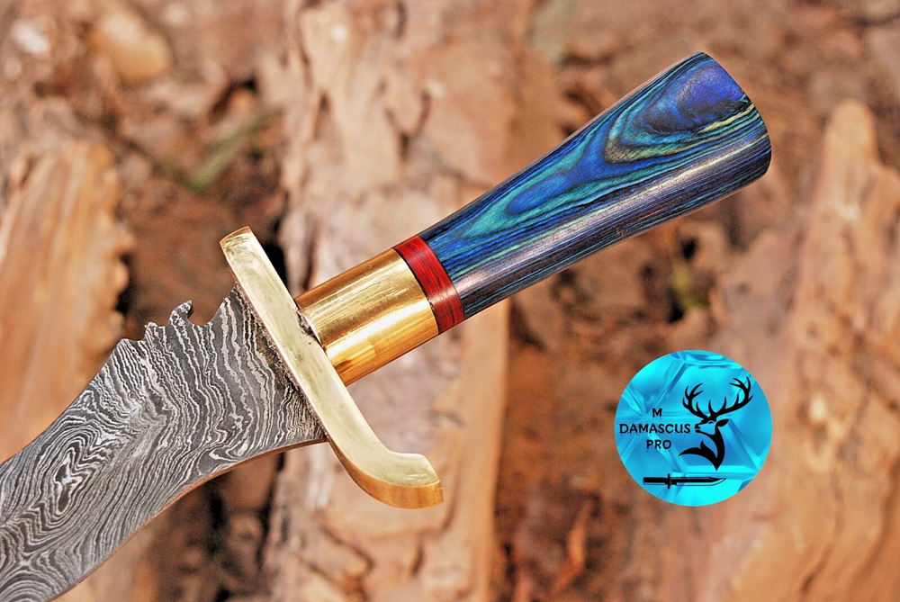 Blade Color: Gray Blade Material: Damascus Steel Original/Reproduction: Original Brand: M DAMASCUS Features: Sheath Included Blade Type: Needle Point Handmade: Yes Vintage: No Blade Edge: VERY SHARP Country of Origin: Pakistan Type: Hunting, Survival, SWORD Handle Material: WOOD & BRASS GUARD HANDLE Dexterity: Ambidextrous Tang: Full Blade Length: 14" INCHES