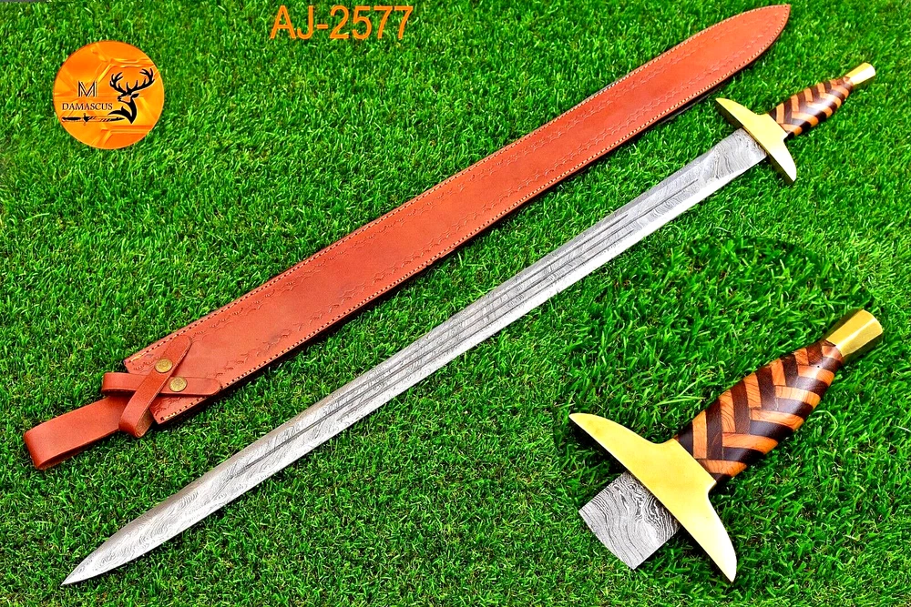CUSTOM HAND MADE DOUBLE EDGE BLADE HAND FORGED DAMASCUS STEEL SWORD Wood & Brass Guard Handle This superb design Sword is hand forged. Blade of this Sword has a nice file work and is made of 512 layers of 4340 stainless steel and 1075 high carbon steel and hardness 55-58 HRC . This robust Sword is lab tested under intense conditions, the balance and shape of this Sword ensures perfect grip. Overall Length: 38” Inches Blade Length: 31” Inches Handle Length: 7” Inches Damascus Design: Twist Pattern Layers: 512 Package Includes: with Leather Sheath Bag Warning: Keep fingers clear of blades. Store away from children.