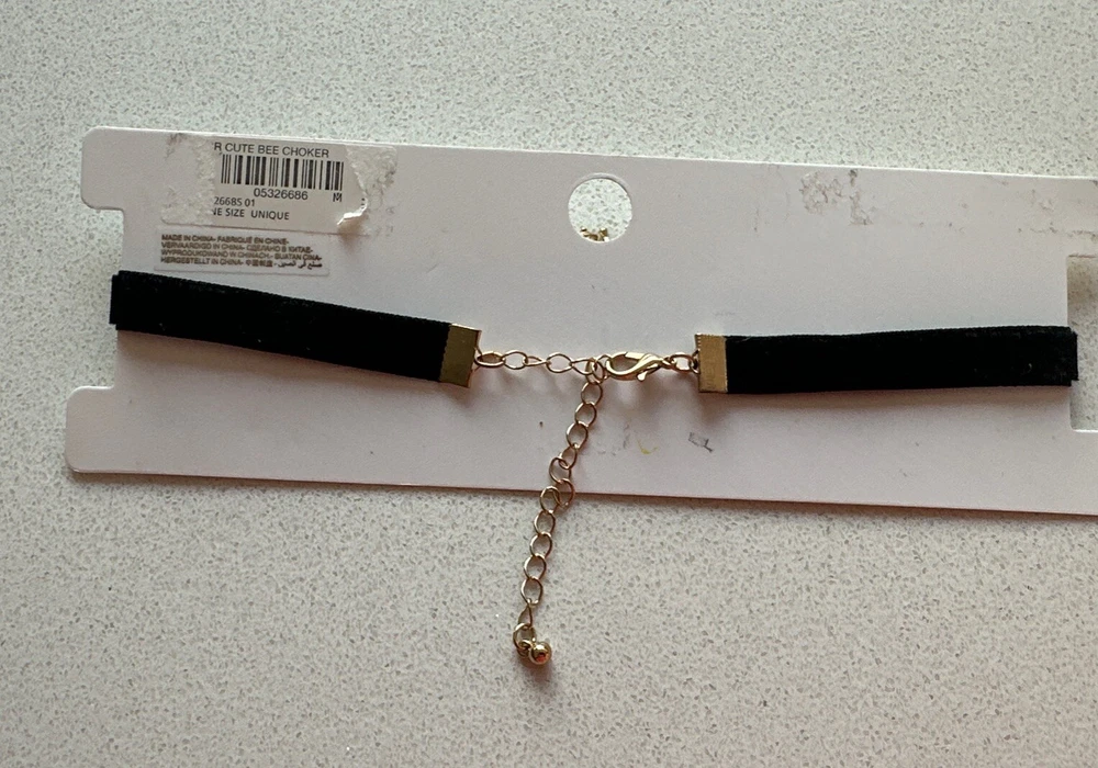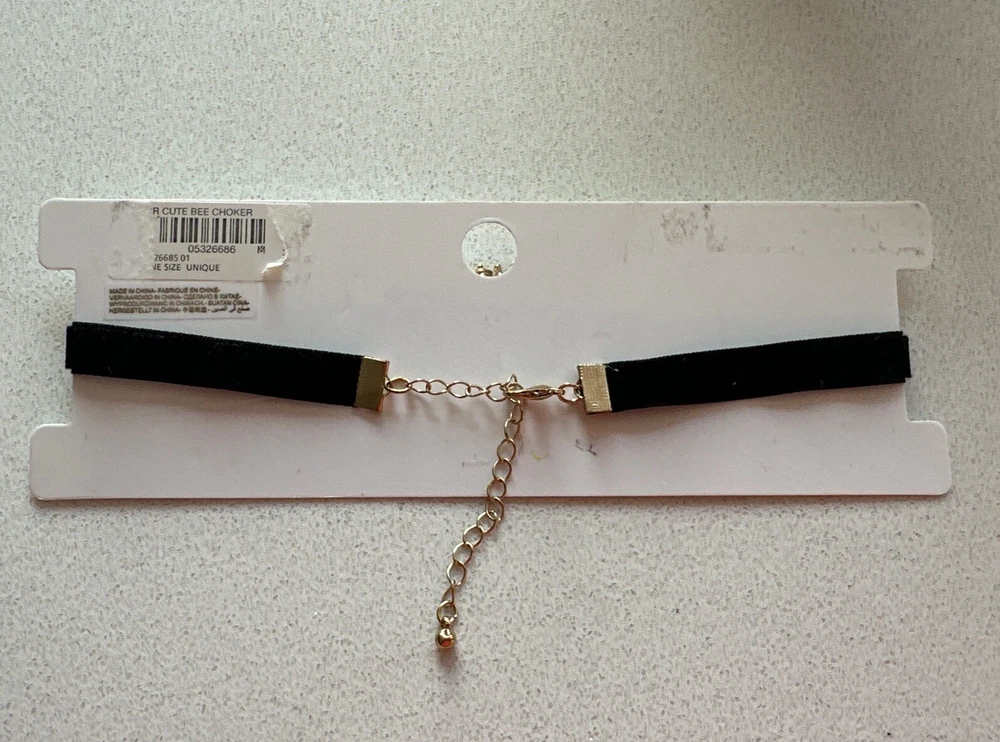 Get ready to buzz with this charming black velvet choker necklace featuring a gold-coloured bee pendant. The adjustable length allows it to fit perfectly around your neck. The necklace is 33-39cm in length and features a gold-coloured bee charm, making it a great addition to any jewellery collection. This necklace is perfect for those who love bees and want to show off their fondness for these fascinating creatures. The pendant shape is a bee. The necklace is not hallmarked and features no secondary stones. The style is a choker, with the pendant/locket type being a charm. The necklace is suitable for young girls or women and is a great addition to any costume jewellery collection.