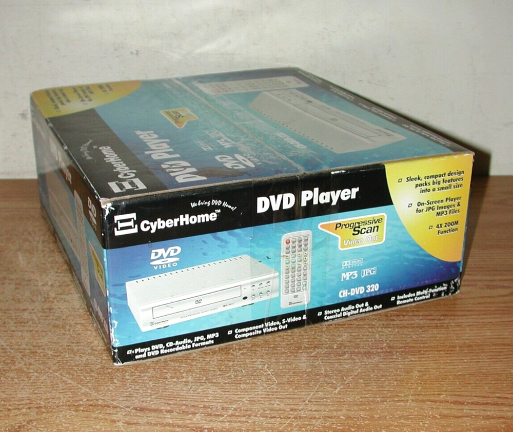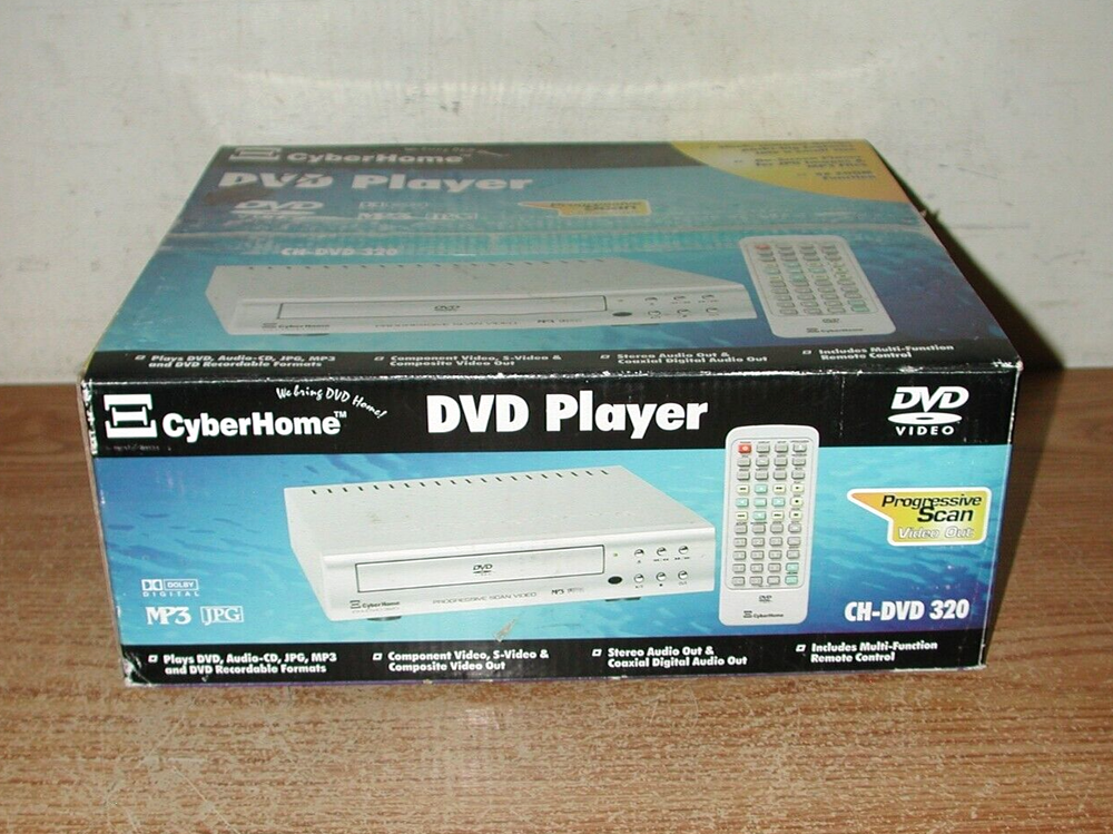 Description: Cyber Home CH-DVD 320 Progressive Scan video out DVD player new in box. Measurement: box is 12" x 11" x 4.58". What Buyer Gets: Cyber Home CH-DVD 320 Progressive Scan video out DVD player new in box. Condition: the DVD player is still new and unused in the box. See the photos for a look at the actual DVD player you will get, because what you see is what you get. Most of the items I sell on Ebay are used and were purchased at Estate sales and auctions, so therefore, they are sold as is. Questions are recommended if you are unsure of anything. I will combine shipping on multiple purchases.