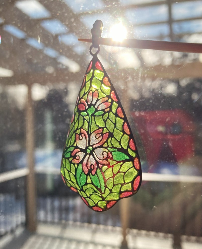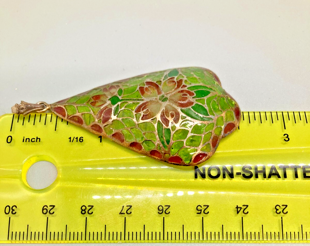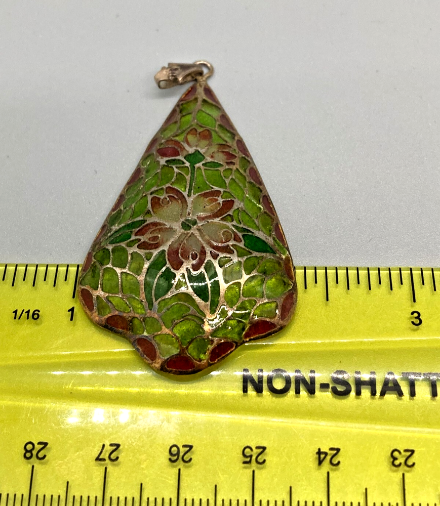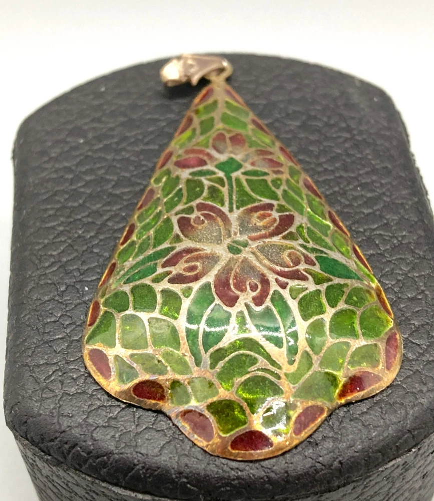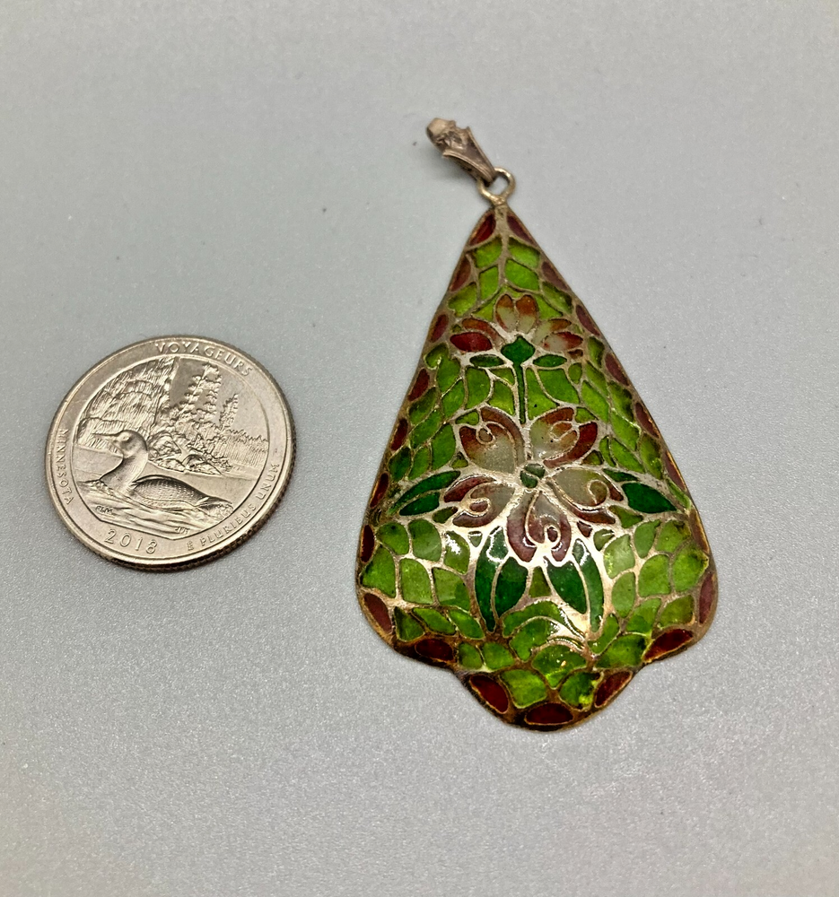 This is an amazing feat of craftmanship. Handmade, this plique du jour pendant seems very old, judging from the ornate bale that has an arts & crafts design. Beautiful greens and pinks radiate from the silver surrounds of each piece of "cathedral window." It hangs about 2.5" inches including the bale and is 1.25" at its widest point. It is marked "sterling" on the bale.