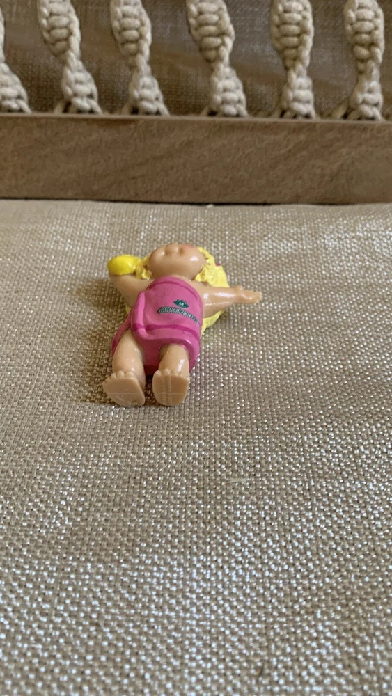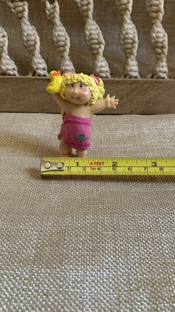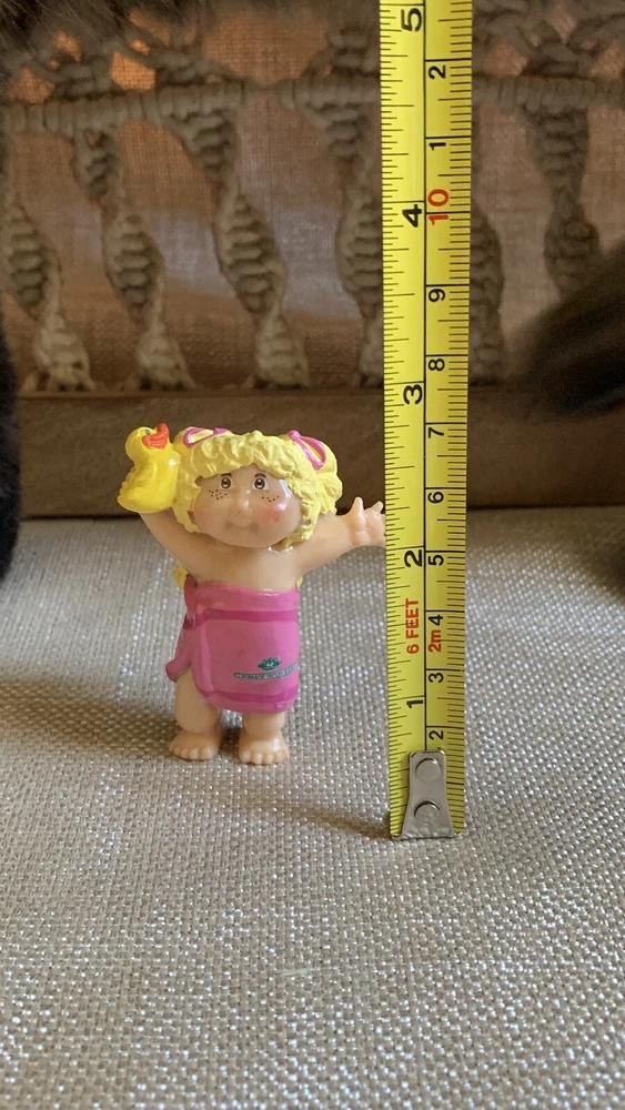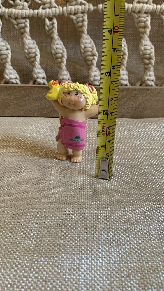 The Cabbage Patch Kids PVC Figure featured is a vintage item from 1984, representing a miniature girl doll with blonde curly hair and brown eyes. This original Cabbage Patch Kids doll is part of the Babies theme and comes dressed in a pink bath towel with a yellow ducky. The doll is made of rubber and does not come with packaging, making it a unique addition to any doll collection. I'm not a collector or expert so please see all photos for condition and let me know if you have any questions or need any more photographs. Due to the reason of light and the display, you can see the picture may have a slight color difference, this is inevitable, please understand. Please review images to make your judgment on cosmetic condition which I believe is a matter of personal opinion. You will get what you see. The photos will overrule the listing title or descriptions if there is any discrepancy.