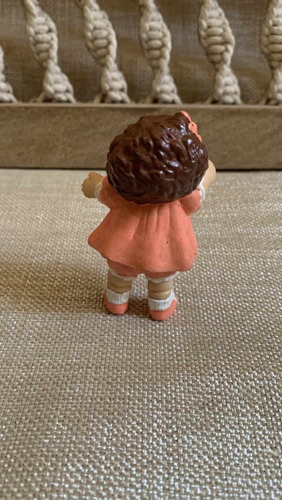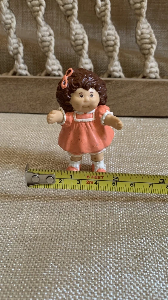 The Cabbage Patch Kids PVC Figure is a vintage collectible from 1984, featuring a miniature girl doll with curly brown hair and brown eyes. She is dressed in a peach-colored dress with a bow in her hair, showcasing the classic Cabbage Patch Kids style. This original Cabbage Patch Kids doll is a part of the franchise's product line and is made of rubber material, making it a unique addition to any doll collection. I'm not a collector or expert so please see all photos for condition and let me know if you have any questions or need any more photographs. Due to the reason of light and the display, you can see the picture may have a slight color difference, this is inevitable, please understand. Please review images to make your judgment on cosmetic condition which I believe is a matter of personal opinion. You will get what you see. The photos will overrule the listing title or descriptions if there is any discrepancy.