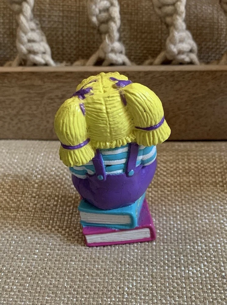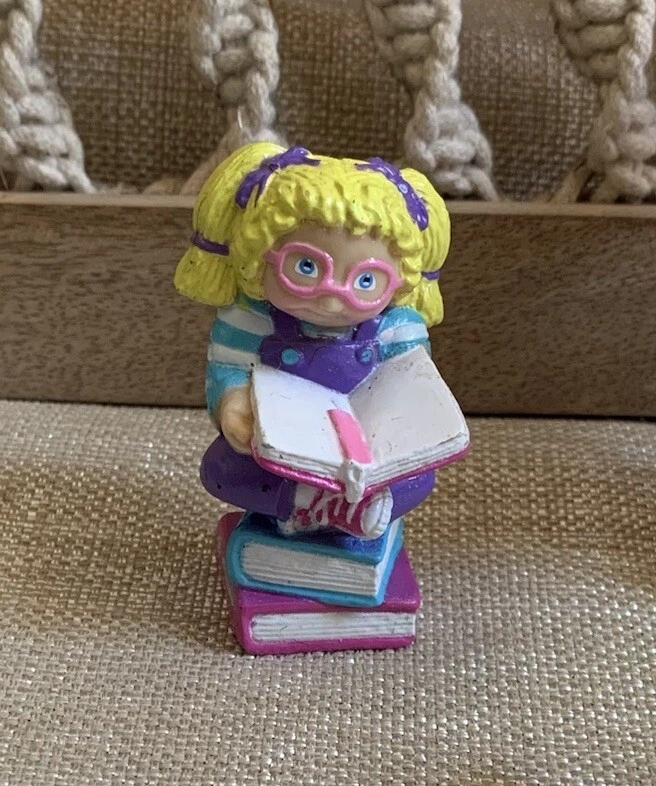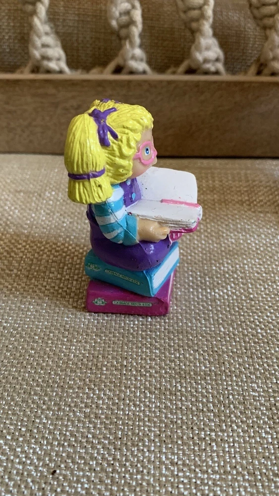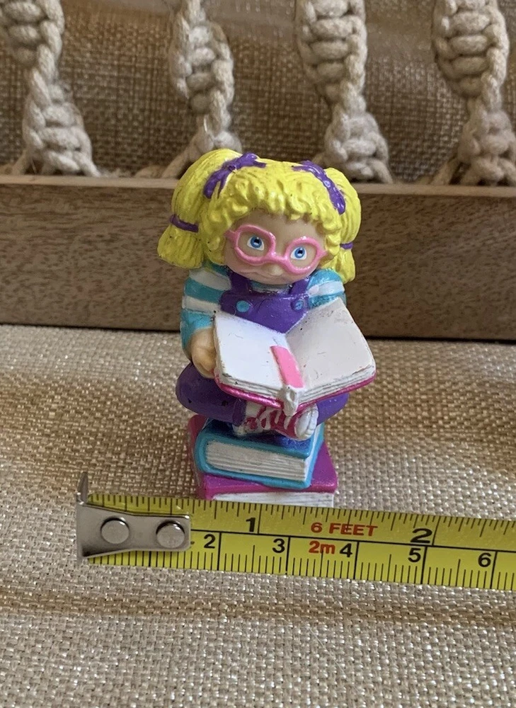The Cabbage Patch Kids PVC Figure is a vintage collectible from 1984, featuring a girl doll with curly blonde hair, blue eyes, and a light complexion. This miniature figurine depicts the doll sitting on books while wearing pink glasses, showcasing a nerdy look. The item is an original Cabbage Patch Kids product, made of rubber and part of the CPK franchise, ideal for collectors of vintage dolls and nostalgic memorabilia. I'm not a collector or expert so please see all photos for condition and let me know if you have any questions or need any more photographs. Due to the reason of light and the display, you can see the picture may have a slight color difference, this is inevitable, please understand. Please review images to make your judgment on cosmetic condition which I believe is a matter of personal opinion. You will get what you see. The photos will overrule the listing title or descriptions if there is any discrepancy.