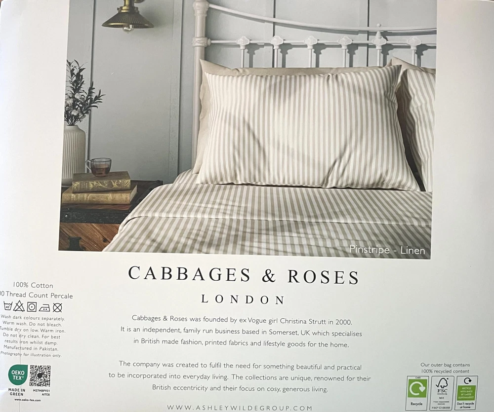 Experience the epitome of luxury with the Cabbages & Roses of London Home Collection Percale Sheet Set. Crafted from 100% high-quality cotton, this four-piece set promises an unparalleled sleep experience, combining elegance, comfort, and practicality. Designed with a crisp and cool percale weave, these sheets are lightweight and moisture-wicking, ensuring you stay comfortable throughout the night. Our sheet set is expertly crafted to provide a wrinkle-free finish, maintaining a pristine look and feel even after multiple washes. The hotel-quality construction offers durability and longevity, making it a valuable addition to any bedroom. Each set includes a fitted sheet with deep pockets that fit mattresses up to 16 inches, a flat sheet, and two pillowcases, ensuring a perfect fit and a stylish, cohesive look. Elevate your bedroom with the timeless elegance and superior comfort of Cabbages & Roses of London. Sleep better, wake refreshed, and enjoy the luxurious feel of our percale cotton sheets. 100% Cotton Percale: Crisp, cool, and breathable fabric ensures a refreshing sleep. Comes In all Bedding sizes:- The King Size 1 King Flat Sheet 112" x 102", 1 King Fitted Sheet 78" x 80", and 2 King Pillowcases 21" x 42" , The Queen Size 1 Queen flat Sheet 94 x 102 In., 1 Queen Fitted Sheet 60 x 80 In FITS DEEP MATTRESS SIZES: Set includes a fully elastic fitted sheet- Premium elastic installed all-around to keep the fitted sheet in place; EXTRA DEEP POCKET Machine wash with cold water, Tumble dry low. Wash with like colors only. Cool iron only. Do not Bleach.